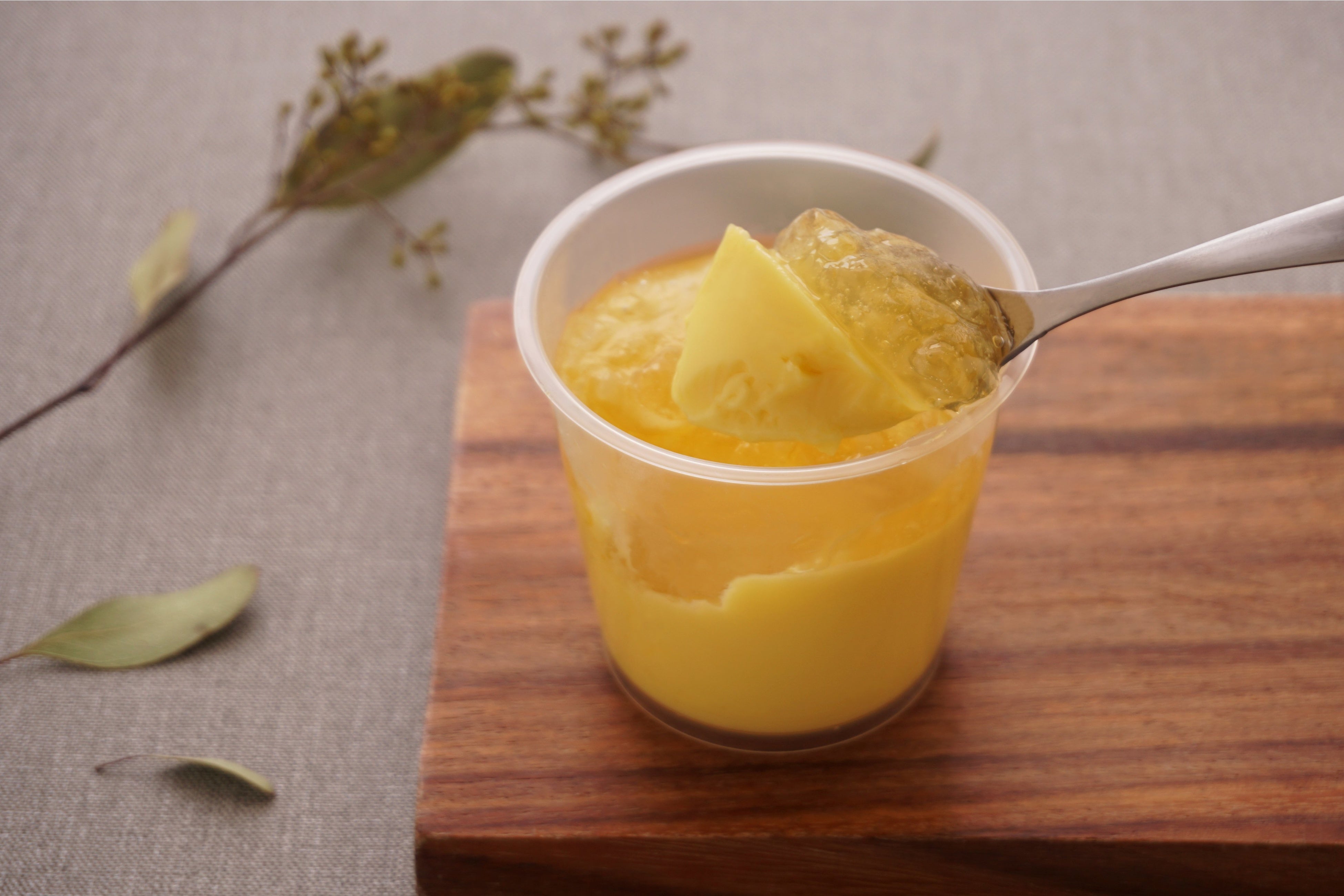 自家製瀬戸内レモンジャムと相性の良い蜂蜜を使用したジュレを、練乳プリンの上にトッピングしています。土台の練乳プリンは酸味の効いた自家製瀬戸内レモンジャムとよく合うよう、通常の卵より甘味やコクが強い原料を使用しています。自家製瀬戸内レモンジャム、はちみつジュレ、練乳プリンを一度に味わっていただいたときの、甘さ、酸味、コクのバランスがよくなるよう調整し完成しました。