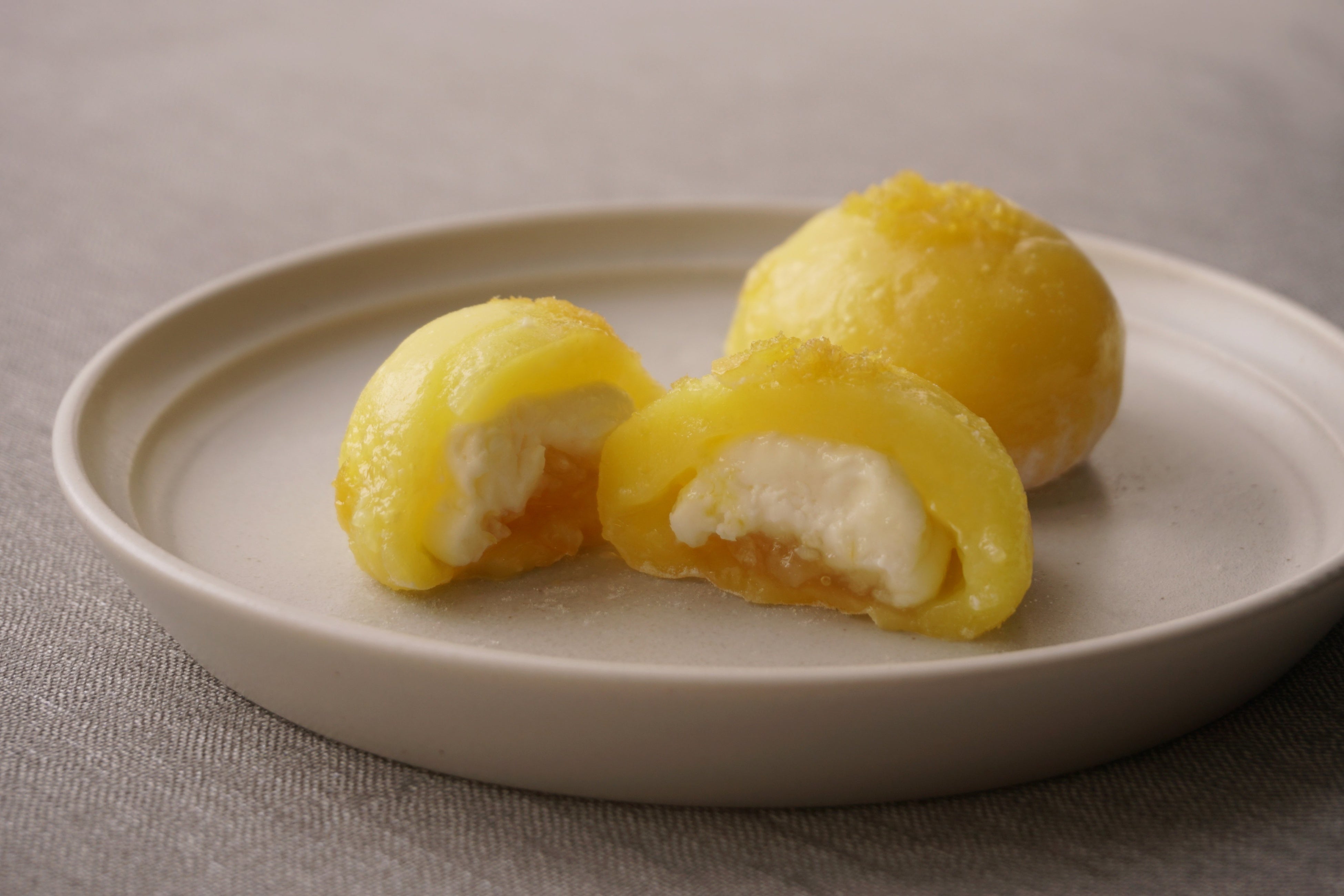 瀬戸内レモンの香りが存分に楽しめるように、羽二重餅に自家製瀬戸内レモンジャムを練りこんでいます。羽二重餅の中には、自家製瀬戸内レモンジャムとレモンと相性のよいクリームチーズを入れています。クリームチーズはホイップフロマージュ(空気を含んだ軽い味わいのクリームチーズ)を使用することで口溶けがよくなるよう工夫しました。羽二重餅の食感、中にいれた口溶けのよいクリームチーズ、爽やかな酸味の効いた自家製瀬戸内レモンジャムの一体感をお楽しみください。