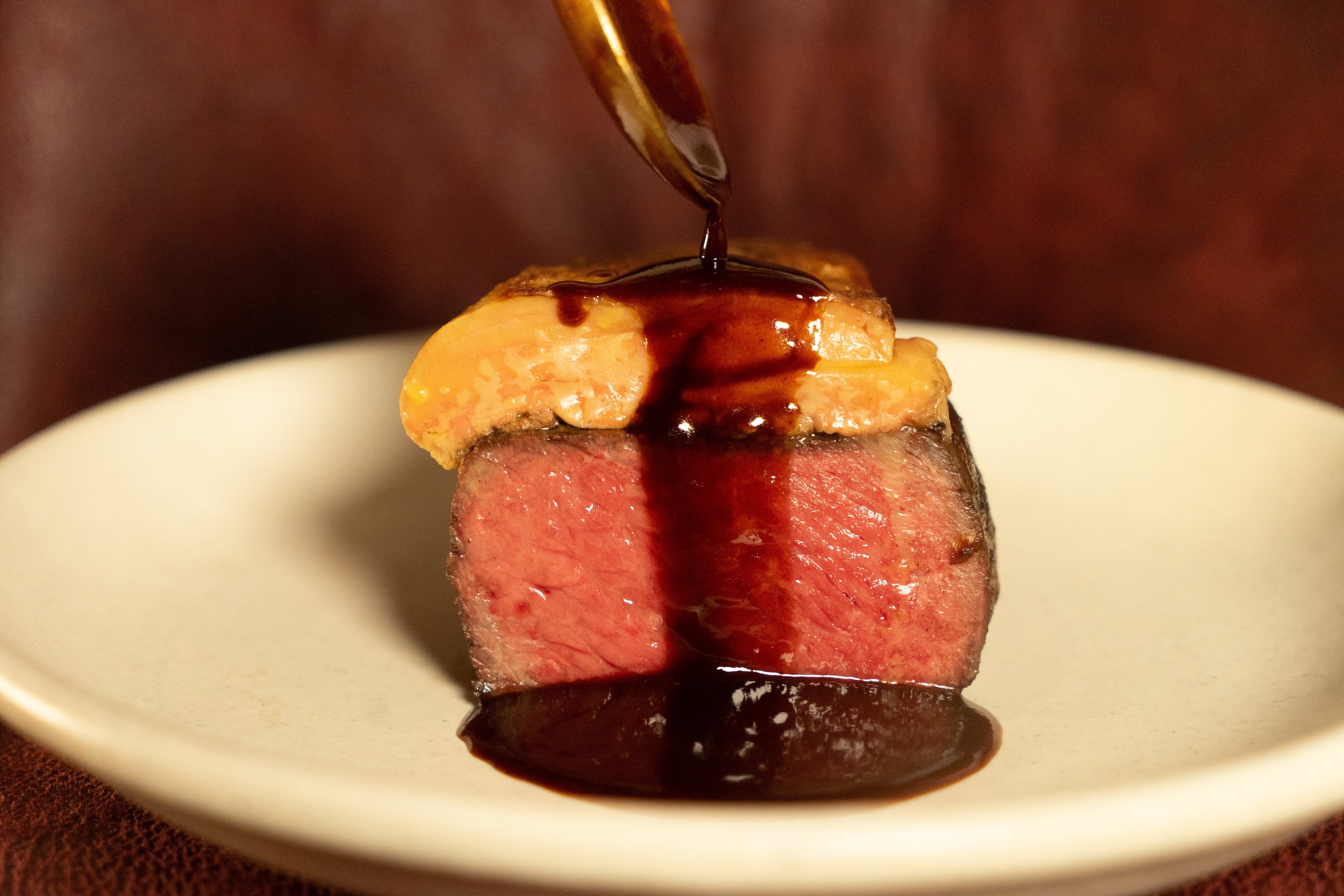 時間をかけて、ゆっくりと焼き上げる肉の旨味は噛んだ瞬間に肉汁が口の中で広がります。これだけでも十分に美味しい肉ですが、今回は贅沢にフォワグラを乗せ旨味を倍増させます。熟成肉ならではの芳醇な香りとフォアグラの濃厚な旨味と甘みが加わることで至福のひと時が訪れます。