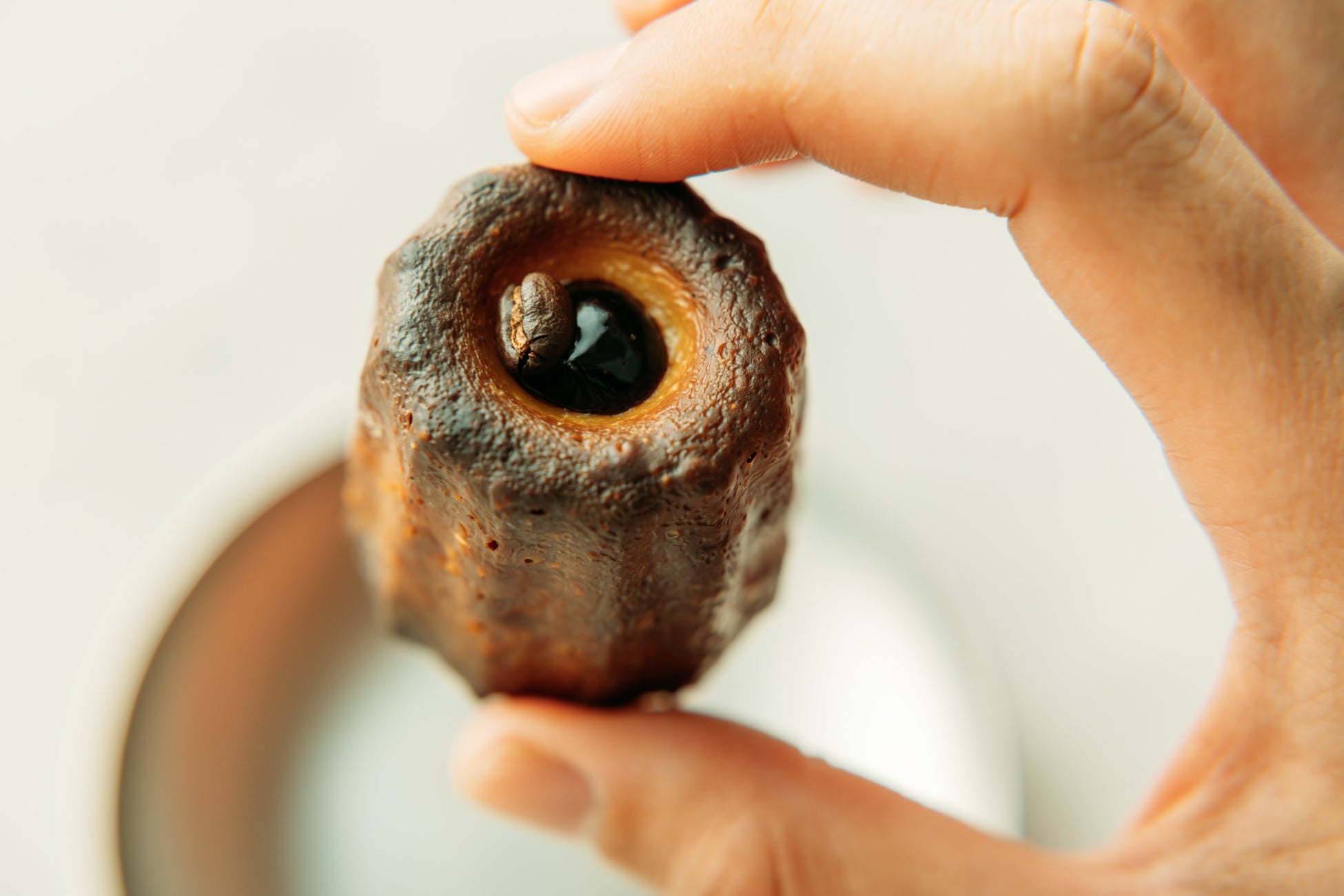 「オリジナルコーヒーカヌレ」は、シンプルながらバニラの優しい甘さが心地良く楽しめる「GINZA Corridor Cannelé」と同じレシピを生地に採用し、そこに「JOE TALK COFFEE」こだわりのエスプレッソを贅沢に使用した濃厚なコーヒークリームを流し込みました。深煎りコーヒーの香りとコク、そしてビターで大人の上品な味わいを引き出します。
