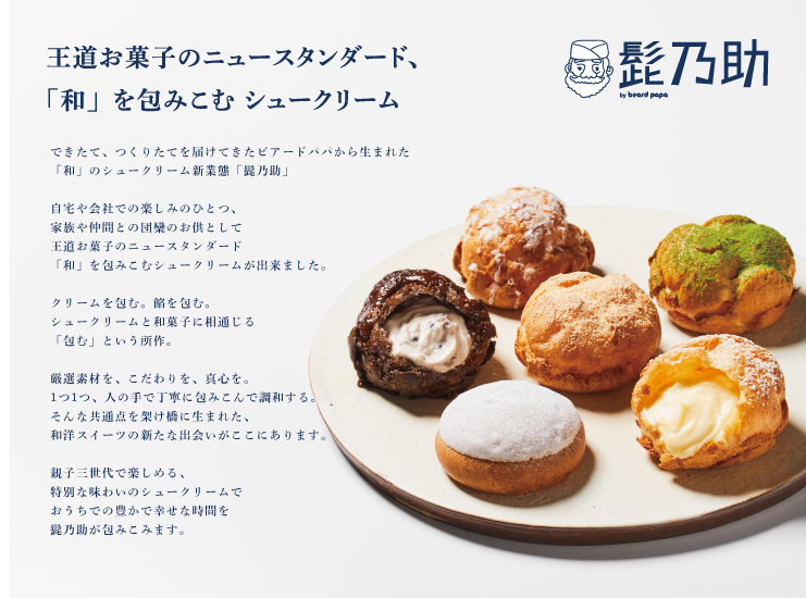 「王道お菓子のニュースタンダード」“髭乃助”のこれまでにはない、「モダンな和洋スイーツ」はご自宅でのおやつの時間にはもちろんのこと、職場の仲間やご友人への手土産にも最適です。