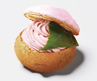 春の足音とともに、ほんのり桜色に色づく求肥をのせたもちもち食感の生地に、さくら風味の餡とクリームを絞った、桜餅のようなシュークリーム。