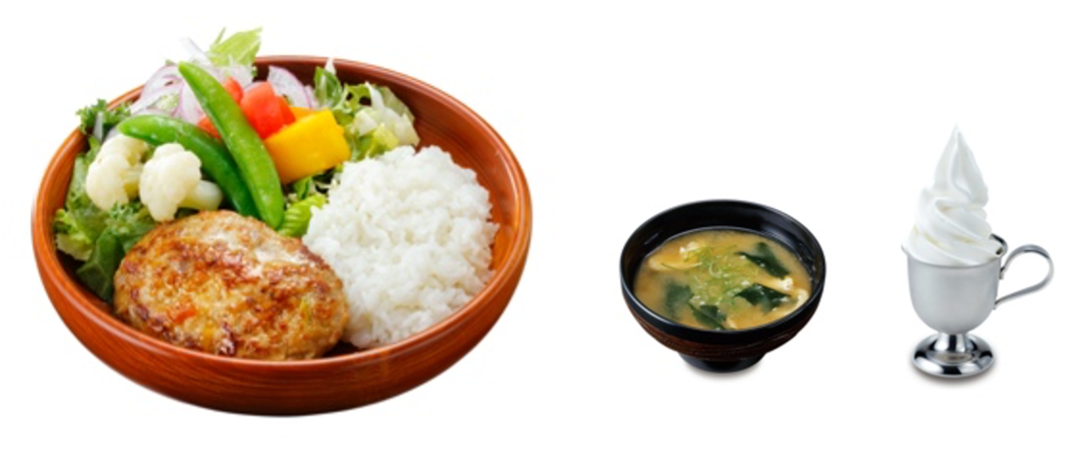 「いろどりセット」は、100gもしくは150gのハンバーグと少なめライス、さっぱりとした味わいのマスタードドレッシングをかけたマンゴー入り8種野菜サラダ(⽩菜、レタス、ケール、ロメインレタス、アーリーレッド、カリフラワー、スナックエンドウ、カットトマト)を添えたハンバーグディッシュと、人気メニューの「みそ汁」、食後にぴったりな小さめデザート「ミニソフト*」のセットになります。「ハンバーグだけではなく適度に野菜も食べたい」、「満腹よりもセットで食べられる満足感が欲しい」という方におすすめです。