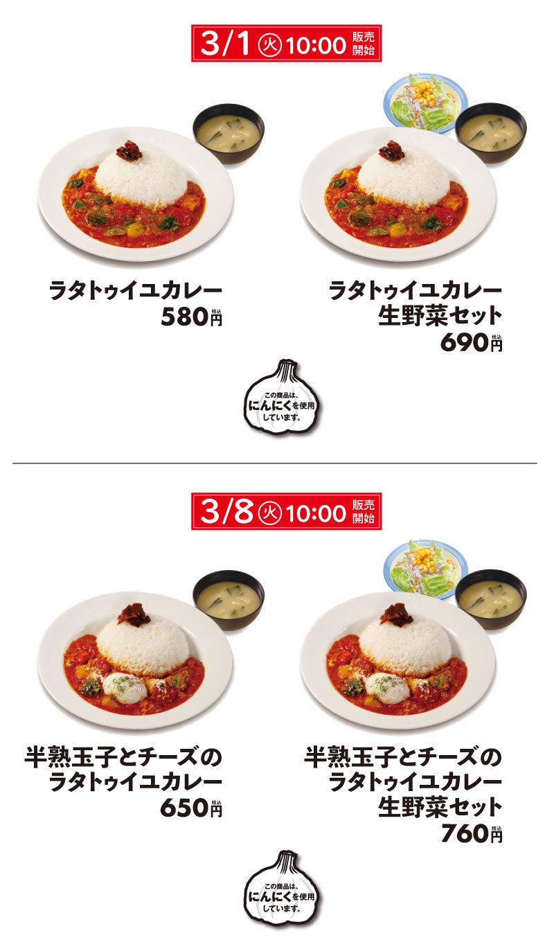| 商品名 ▶2022年3月1日(火)午前10時発売 ラタトゥイユカレー(みそ汁付) 580円 ラタトゥイユカレー単品 460円 ▶2022年3月8日(火)午前10時発売 対象店舗 一部店舗を除く全国の松屋 |