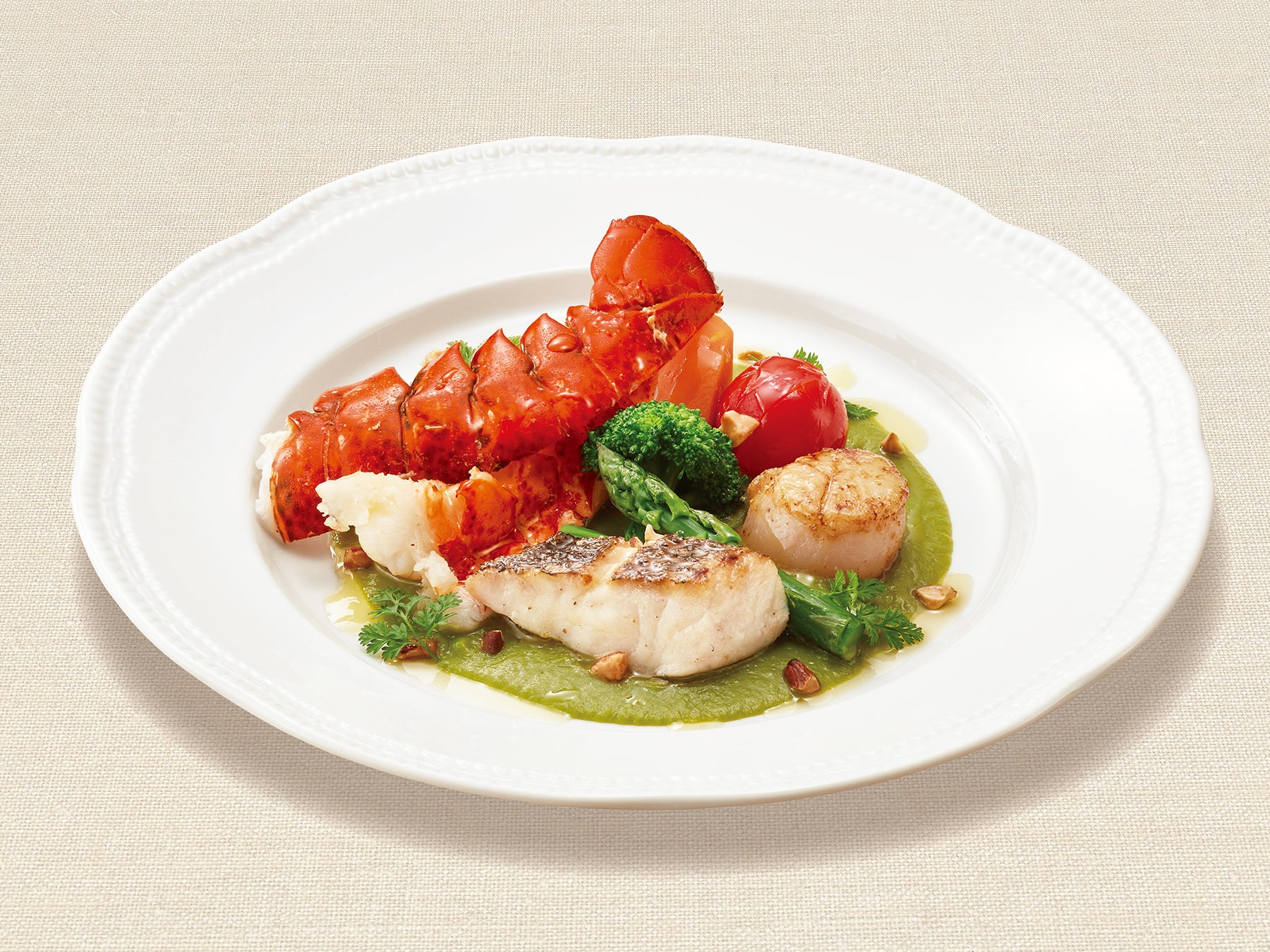 オマール海老・真鯛・帆立のグリル~グリーンピースソース~