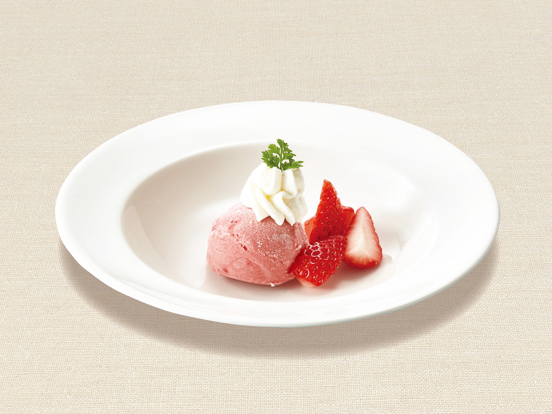 フルーツソルベに果肉を添えた、さっぱりとした食後のデザートです。デザートの内容は時期によって変わります。(写真は3月時点のデザート「苺のソルベ」です)