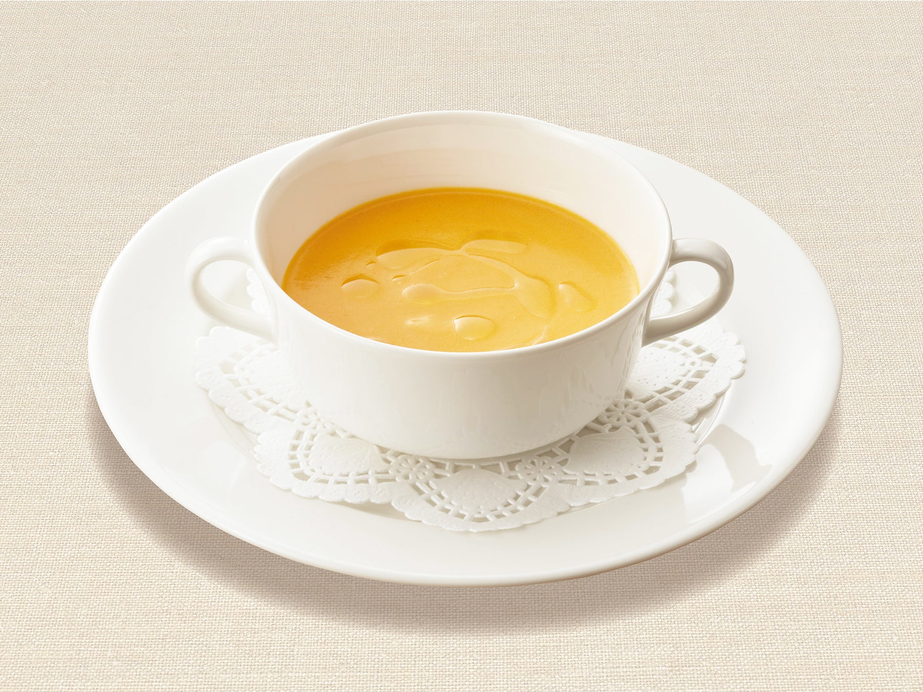 にんじんのほのかな甘みが感じられるクリーミーな味わいのスープです。にんじんのピューレに牛乳や乳製品を合わせて滑らかにして玉ねぎなどの野菜の甘さを加えました。少量の香辛料を加えてすっきりとした香りに仕上げています。