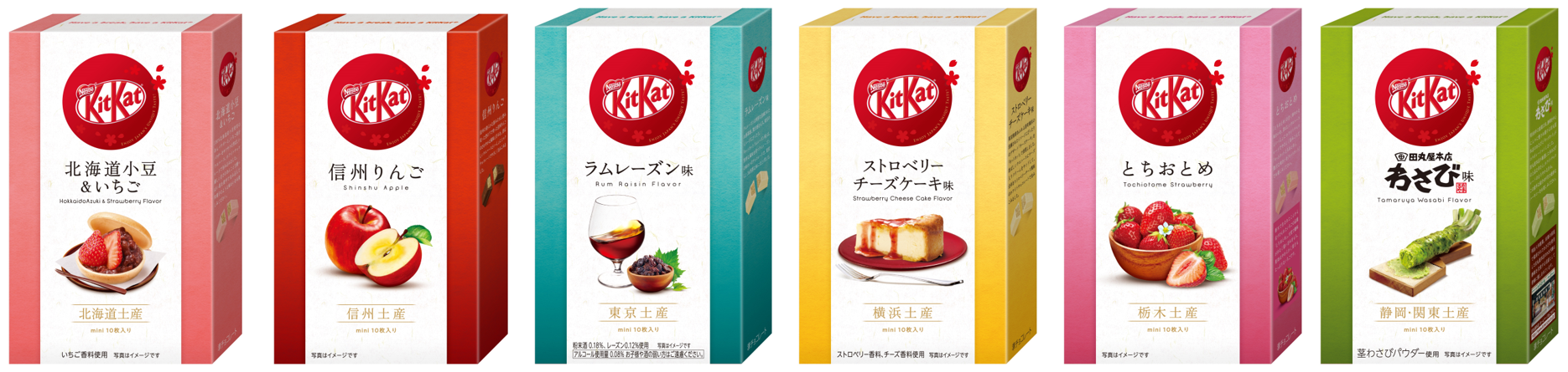 日本各地の名産品や各地域の企業とコラボレーションした「ご当地キットカット」を2021年10月にリニューアルしました。自宅用のお土産ニーズに合わせて、外箱デザインをよりカジュアルな「縦型」仕様に刷新し、より求めやすい価格帯へと変更いたしました。また、1枚当たりが大きくなり、より満足感のある食べ心地を味わえます。