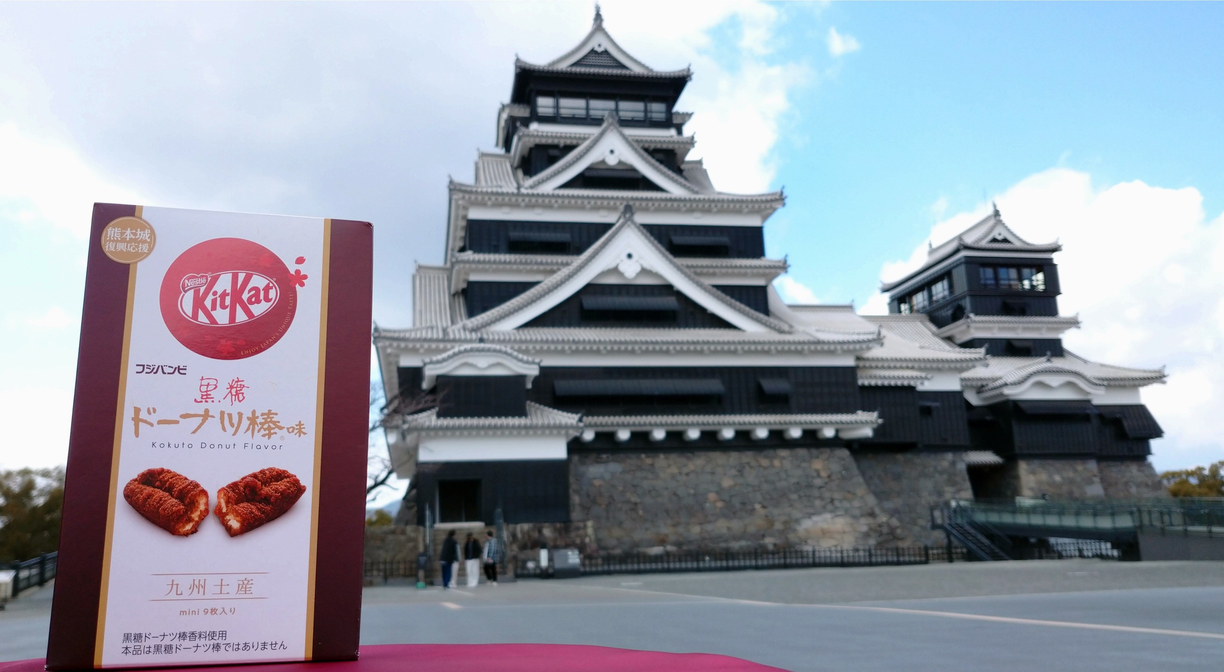 このたびネスレは、国内観光市場の復活に向け、復興応援の意味も込めて、新しい「ご当地キットカット」の販売エリアとして九州・熊本を選定し、熊本銘菓として代表的なフジバンビ「黒糖ドーナツ棒」(※参考資料)をテーマに、両社で「キットカット ミニ 黒糖ドーナツ棒味」を共同開発いたしました。