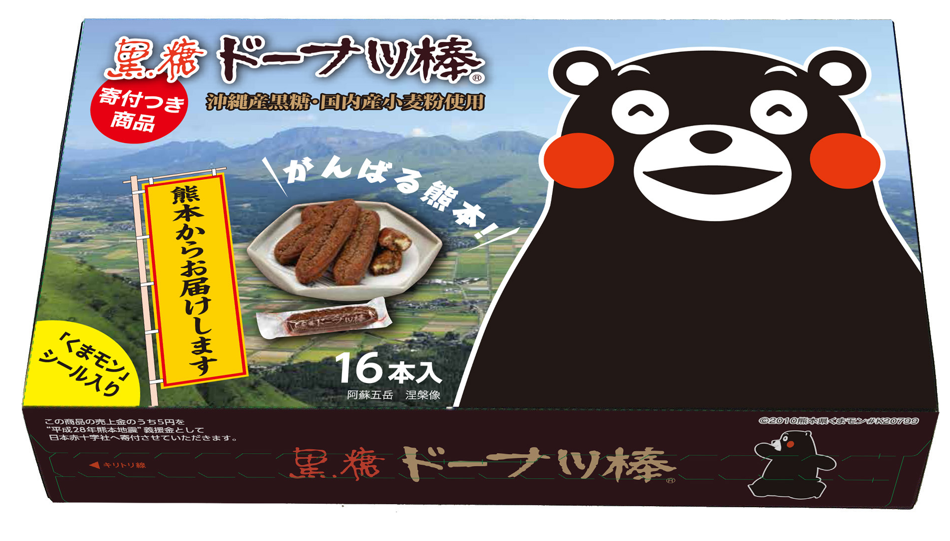 ・「黒糖ドーナツ棒 火の国パッケージ」、「黒糖ドーナツ棒 熊本城缶入り」を販売。12万円を熊本へ寄付。