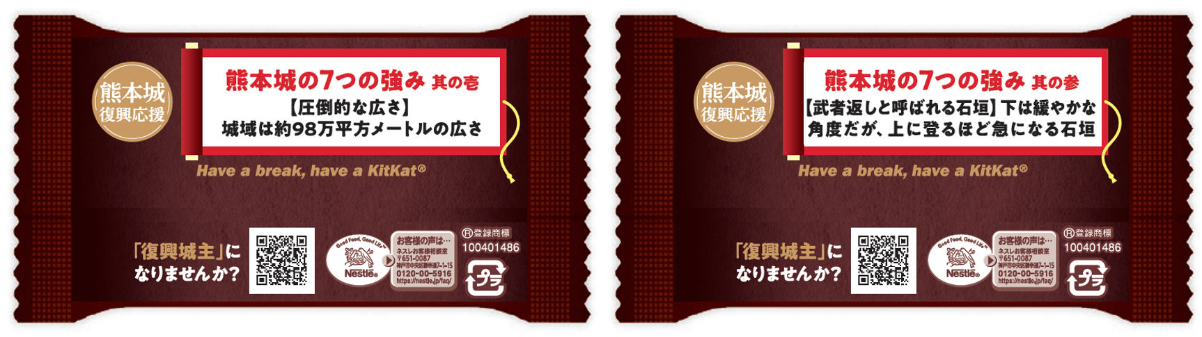 さらに、熊本地震の復興支援の一環として、熊本城の復旧・復元に向けた寄付制度である「復興城主」(※参考資料) を外箱にデザインし、個包装の裏面には熊本城の隠れた魅力を描いています。ネスレとフジバンビは、本製品の販売を通して、熊本城の復旧・復元を応援してまいります。