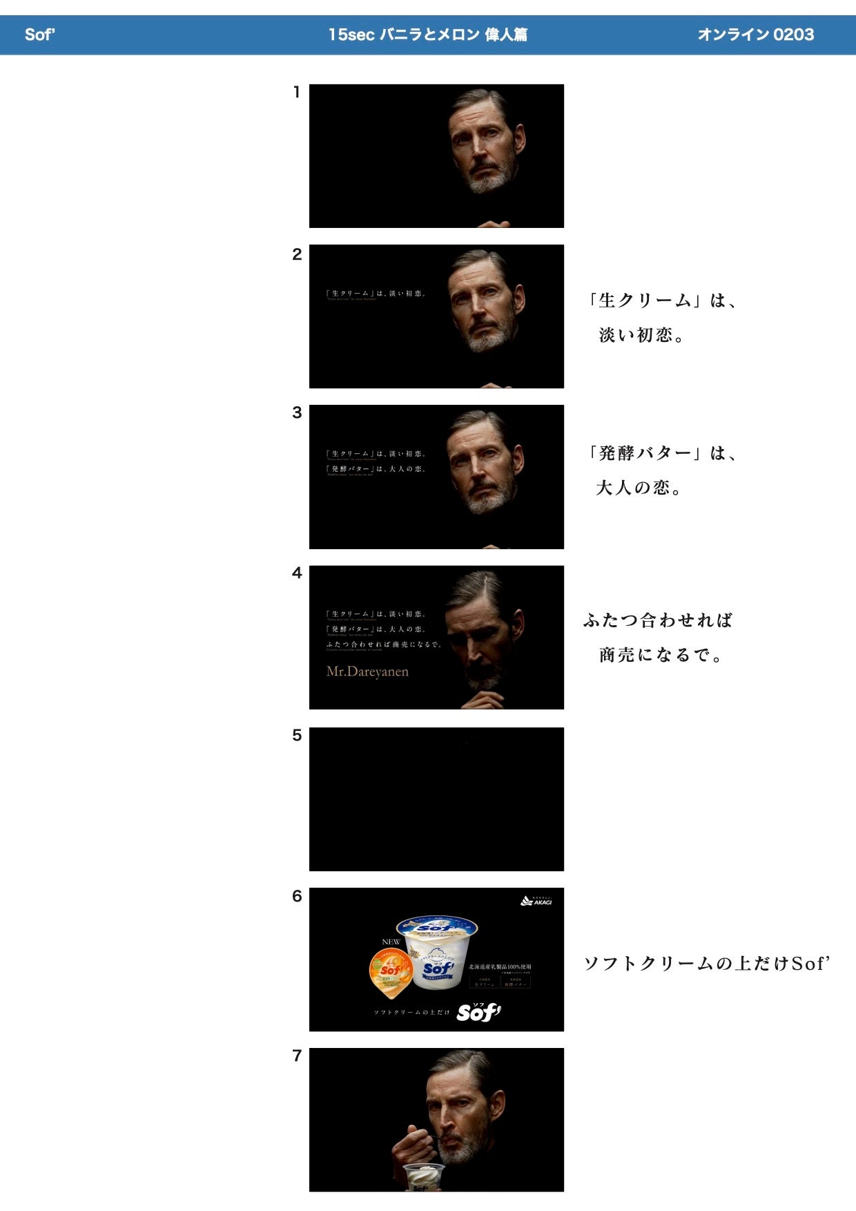 新商品の発売に伴い、TV-CMを2022年2月28日(月)からオンエアいたします。新しいSof’(ソフ)の素材の良さ、本格感を訴求するために、偉人風のMr. Dareyanen(ミスターダレヤネン)が、格言のように商品の特徴を伝え、上質な世界観で描いた企画。商品特徴の「発酵バター」と「生クリーム」を恋に喩えながら、物思いにふけるDareyanen氏を描く「偉人篇」。そして、Dareyanen氏のメッセージを受け取った、物憂げな眼差しの女性を描く「映画篇」。アイスの特徴を伝えてるのに、アイスのCMっぽくない、斬新な世界観のCM展開となっております。