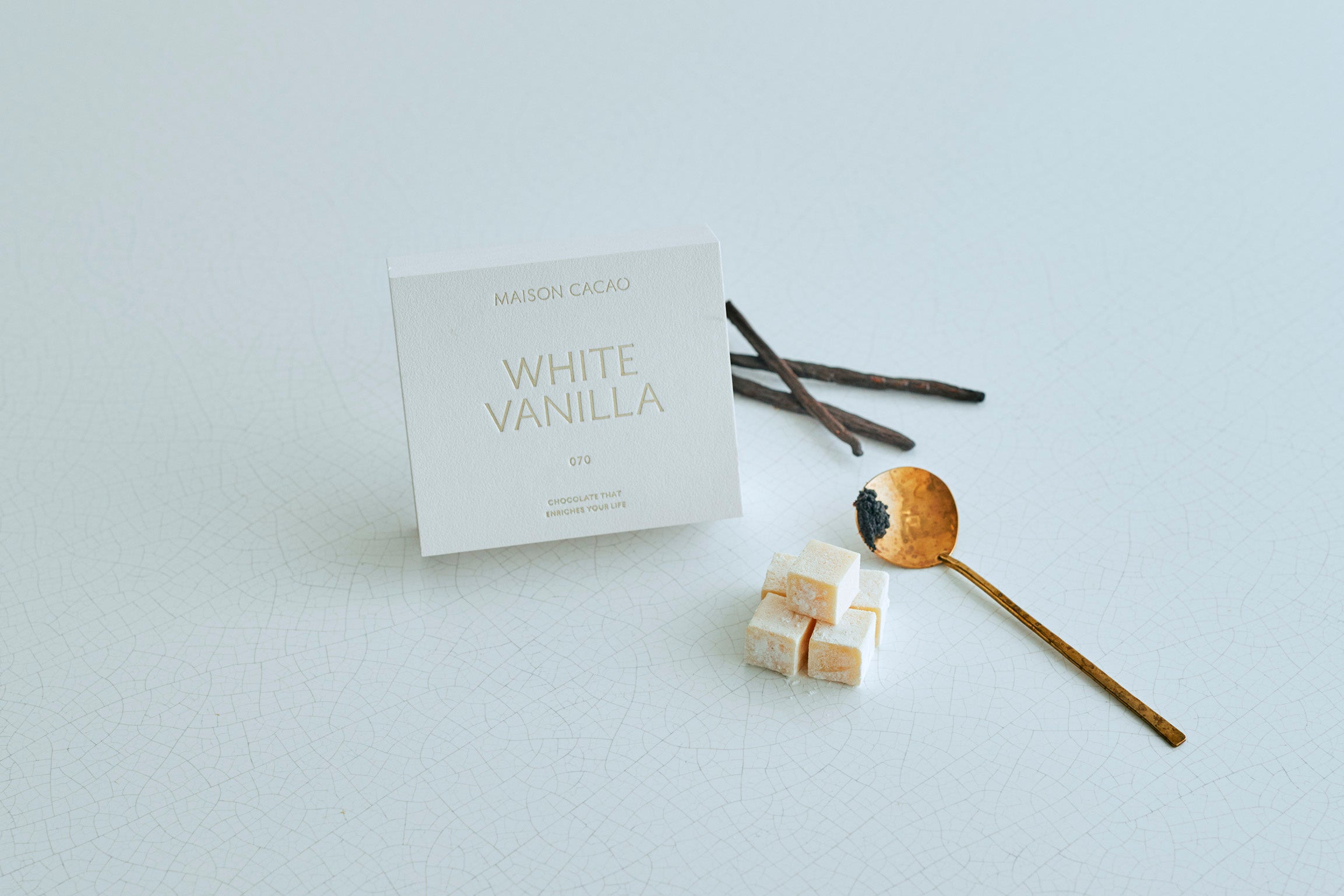 丁寧に発酵、焙煎して抽出した、カカオ本来の華やかな香りを持ち、口どけなめらかなピュアカカオバターのみを使用したホワイトチョコレートに、芳醇な香りのバニラビーンズを合わせました。とろけ出すとともに、柔らかな甘みと深い香りが広がる、2022年ホワイトデー限定の一品です。