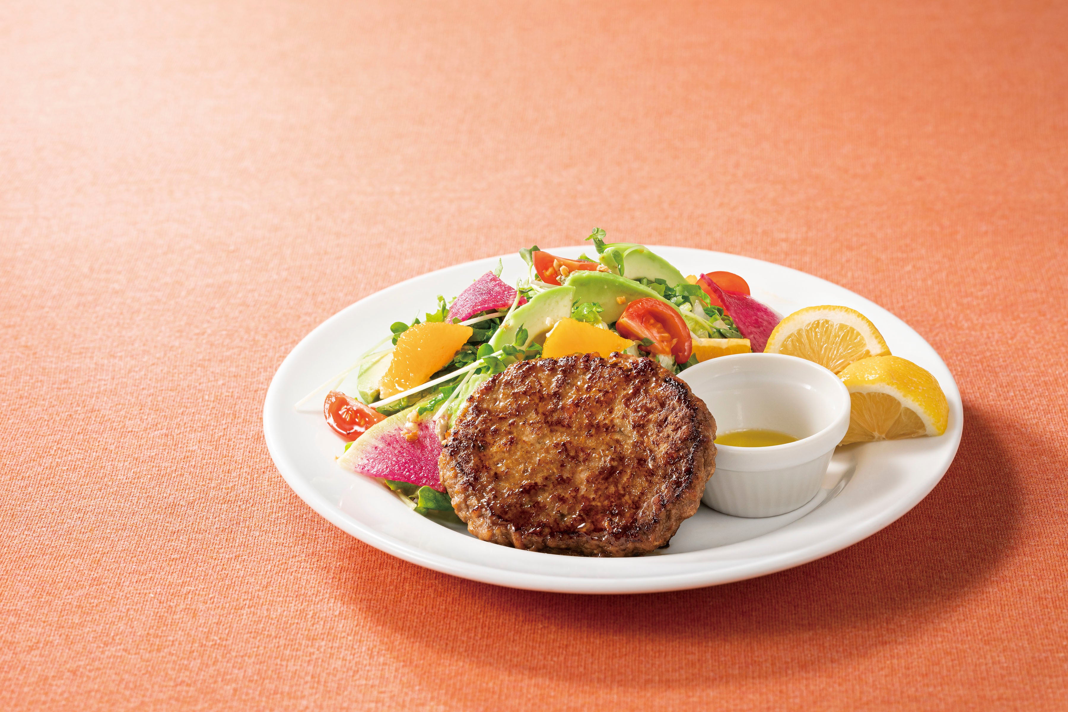 主に大豆を使用したゼロミートハンバーグと野菜をバランスよく組み合わせました。ヘルシーながらも満足いただける1品です。風味豊かな自家製のレモンドレッシングでお召し上がりください。