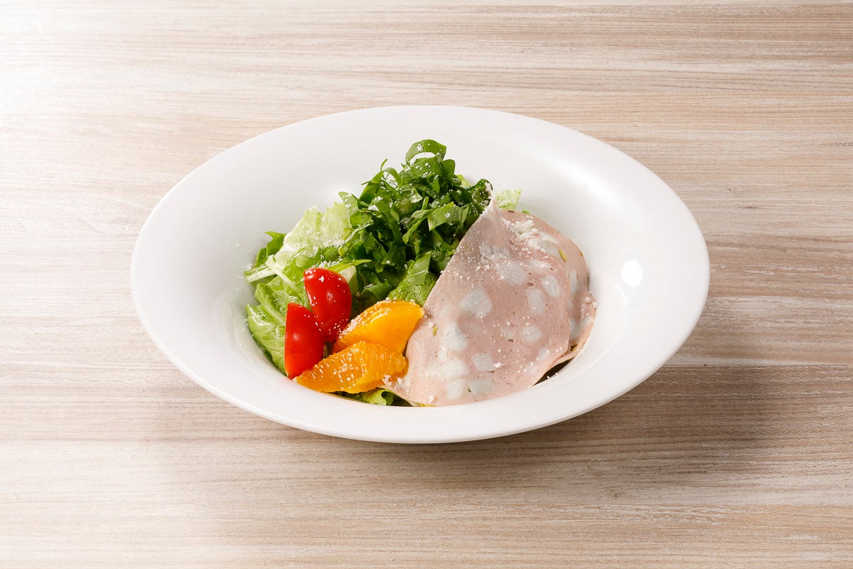 イタリア・ボローニャの伝統的なソーセージ「モルタデッラ」をトッピングした、シンプルなサラダ。ほんのりとした苦味と辛味をもつルッコラ、プチトマトやオレンジを盛り合わせて、みずみずしく彩りあざやかに仕立てました。ドレッシングは、風味豊かな自家製レモンドレッシングでどうぞ。