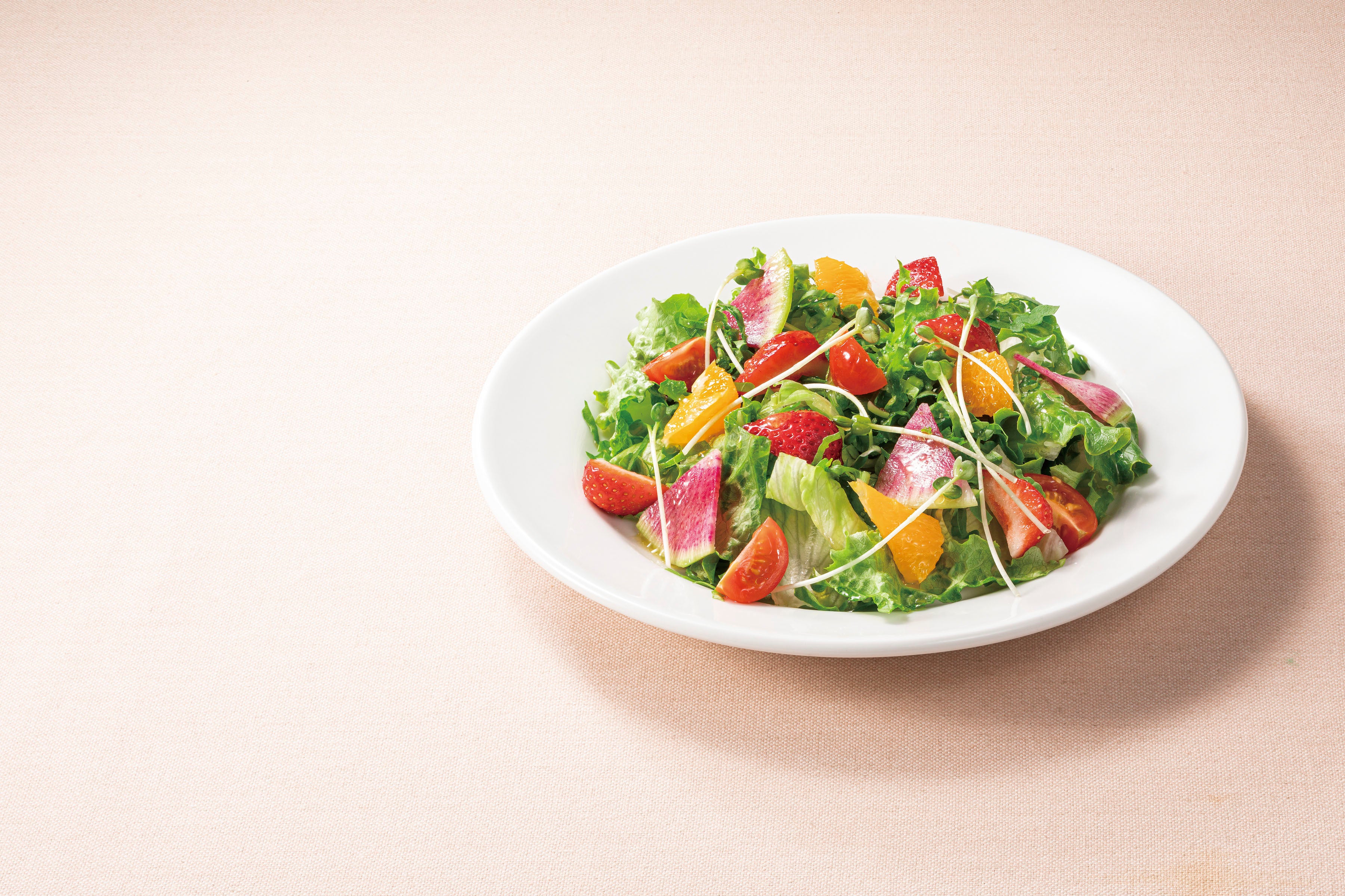 旬のフルーツをちりばめた、お花畑のようなサラダが登場! 今回は、真っ赤な果実が魅力の「あまおう」をトッピングしました。風味の良いルッコラ、あざやかな紅芯大根、みずみずしいプチトマトやオレンジなど、明るい色合いに春の訪れを感じる一皿です。ドレッシングは、すっきりとした味わいの自家製レモンドレッシングで。