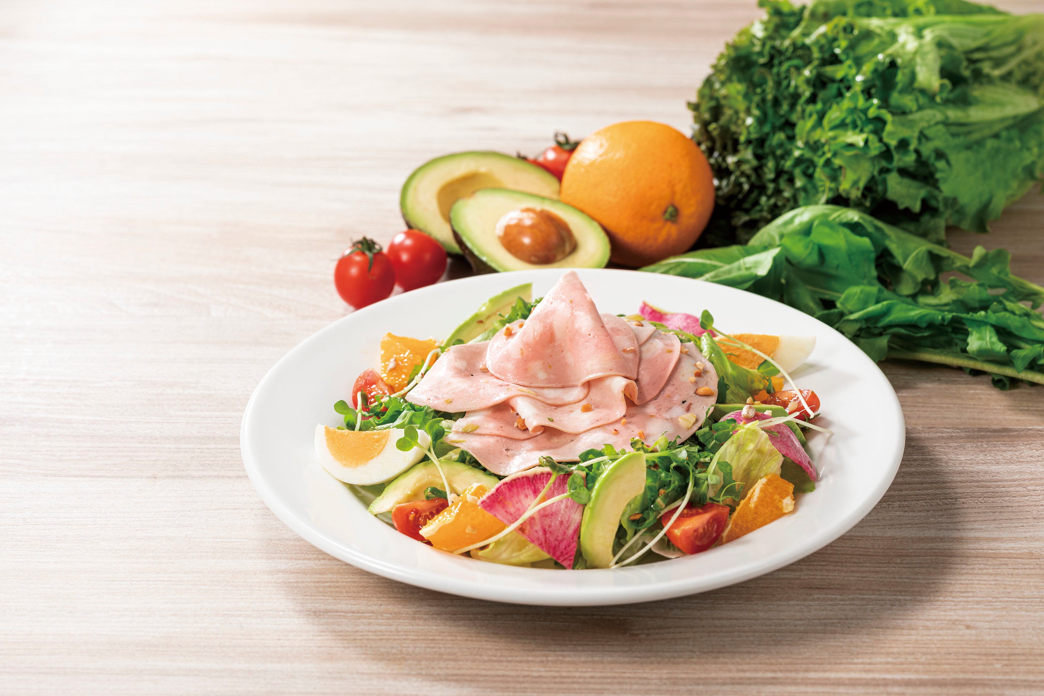 イタリア・ボローニャ発祥のソーセージ「モルタデッラ」をのせた、春らしい色合いのパワーサラダが登場です。まろやかなアボカドも相性抜群! そのほか、フレッシュ野菜、ゆでたまご、ミックスナッツなど盛りだくさんの一皿です。ドレッシングは、「4種チーズのシーザードレッシング」「コブサラダドレッシング」「レモンドレッシング」「にんじんドレッシング」からお選びいただけます。