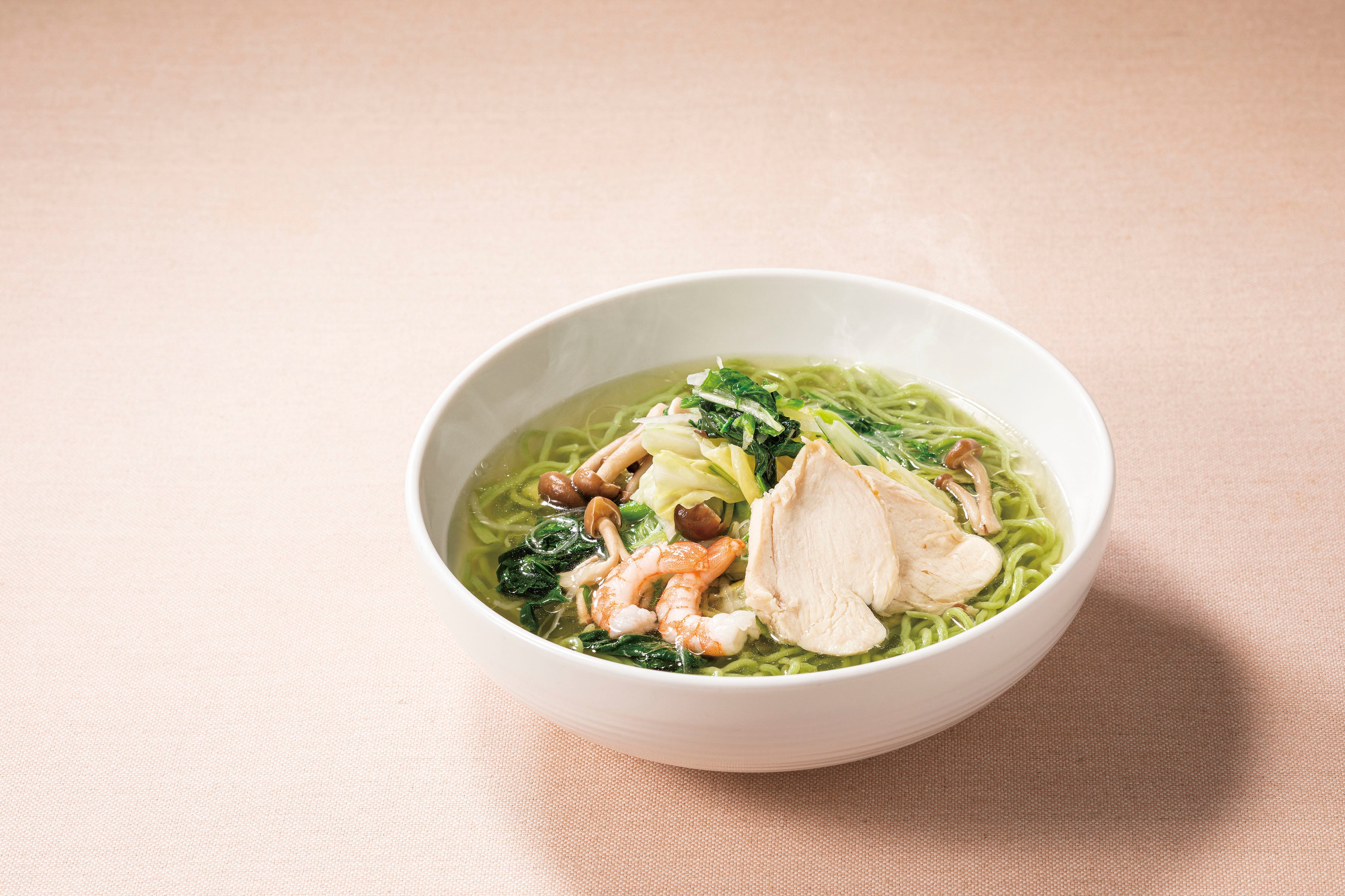 ハッとするほどあざやかな色合いが美しい翡翠麺。ほうれん草を練り込んだ麺に塩ベースのスープを合わせました。スープは和風だしとチキンベースをブレンド。あっさりとしながらも深みのある味わいです。ハーブ鶏、海老、野菜をのせて、仕上げに「MCTオイル」をひとまわし。たっぷりの野菜と良質なエネルギーを摂れる、からだにうれしい一品をぜひご賞味ください。