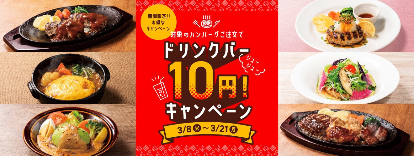デニーズ(株式会社セブン&アイ・フードシステムズ 東京都千代田区二番町8-8)では、2022年3月8日(火)より3月21日(月)まで、デニーズの新ハンバーグをお得に楽しんでいただきたく、対象のハンバーグメニューをご注文のお客様にはドリンクバーが今だけ10円になるキャンペーンを実施します。