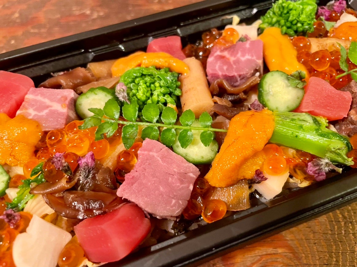 1. 牛フィレ肉のちらし寿司 (1,980円 税込) ※お重サイズ:縦約94× 横217× 高さ45(mm)