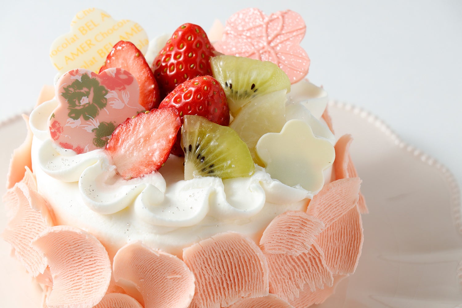 白桃と苺、ホワイトチョコクリームをふわふわのスポンジでサンドし、桜色のコポーやフルーツでデコレーションを施しました。