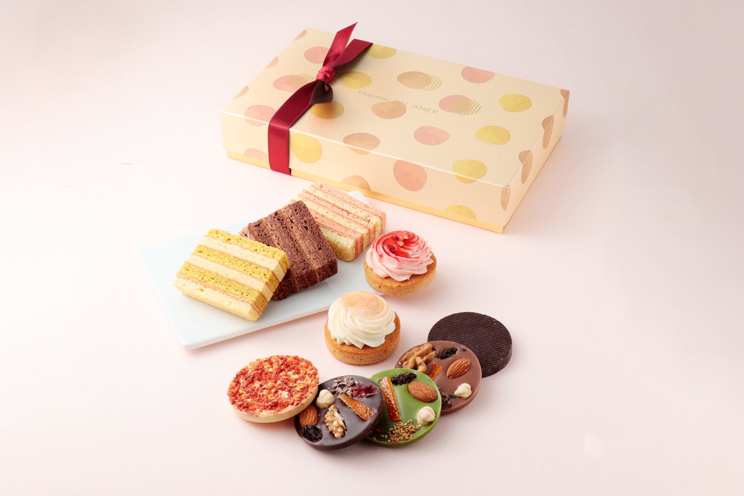 ムースショコラケーキ2コ、ガトーミルフィーユ3コ、パレショコラ5枚を詰め合わせた、焼菓子とショコラの両方を楽しめるバラエティ豊かなアソートです。