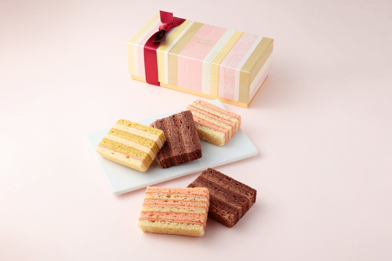 しっとりと焼き上げた2種類のビスキュイ生地にガナッシュとフルーツジャムを何層にも重ねたケーキ仕立ての焼菓子「ガトーミルフィーユ」。