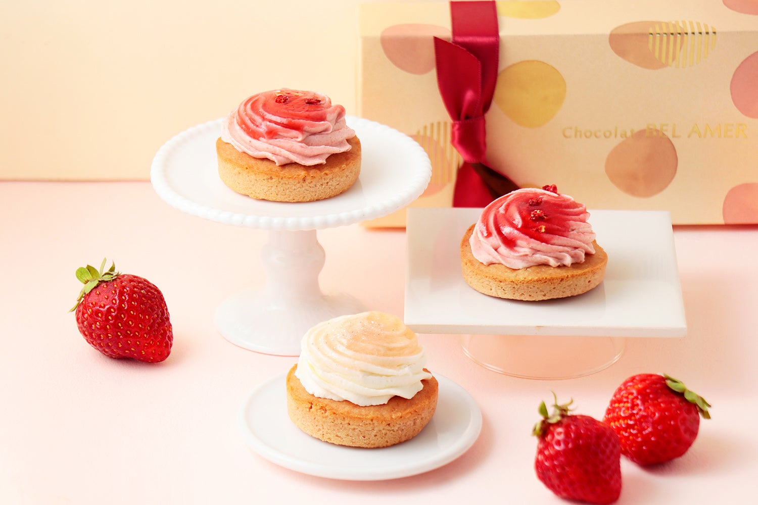 苺のピューレやパウダー、自家製のドライ苺など様々な形で苺を取り入れ、甘酸っぱい苺とショコラのマリアージュを存分にお楽しみいただけます。