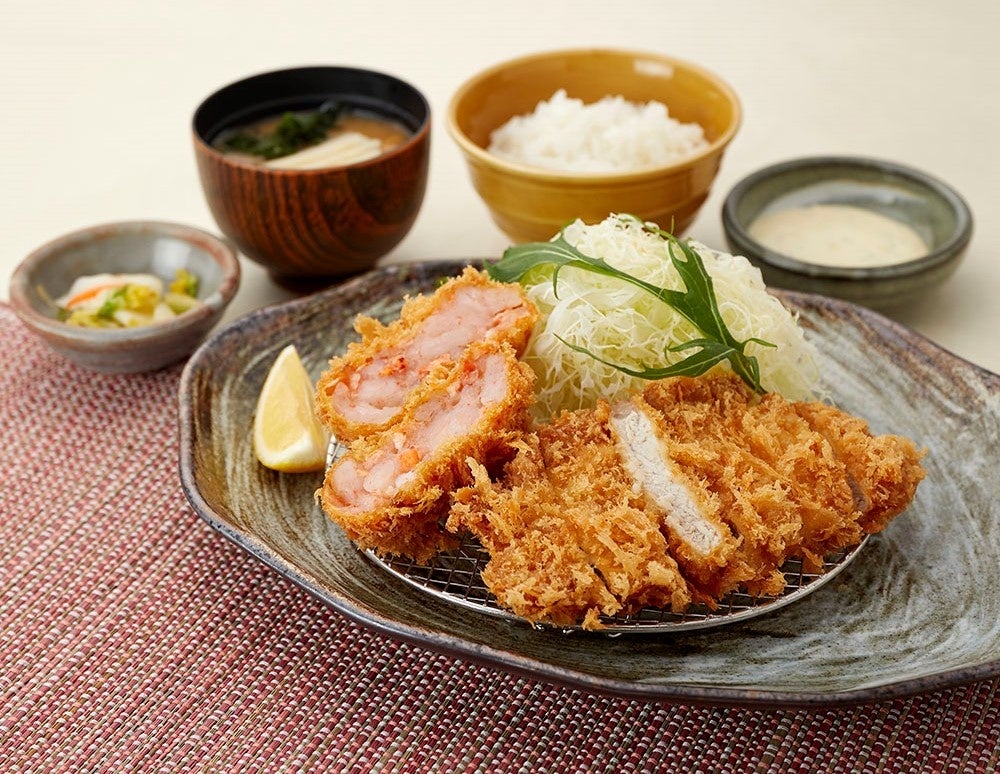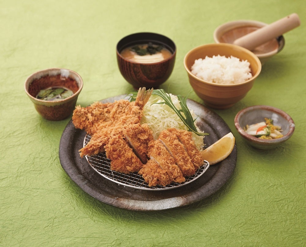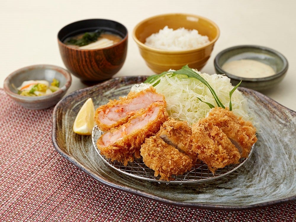 プリプリ食感のバナメイ海老・桜色と香りが楽しめる桜海老・うま味と甘みの甘海老を使用したつなぎなしのプリプリの海老かつと、うま味を閉じ込めた本格的な味わいのヒレかつを盛り合わせました。