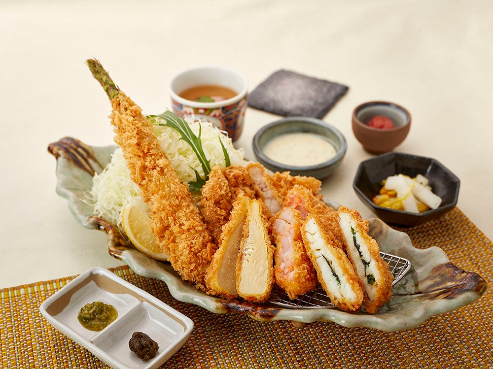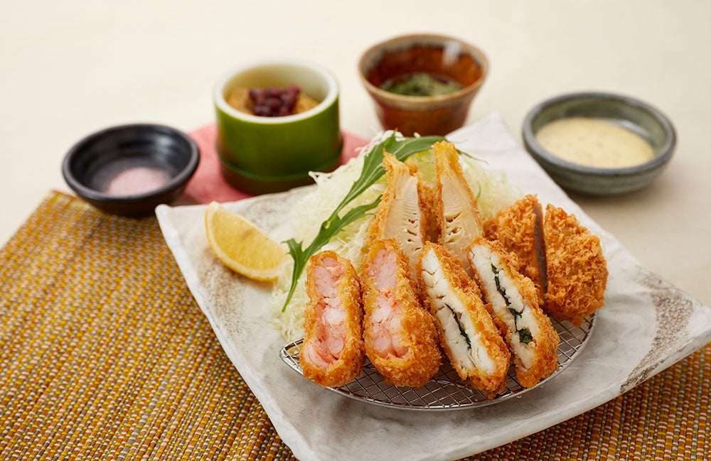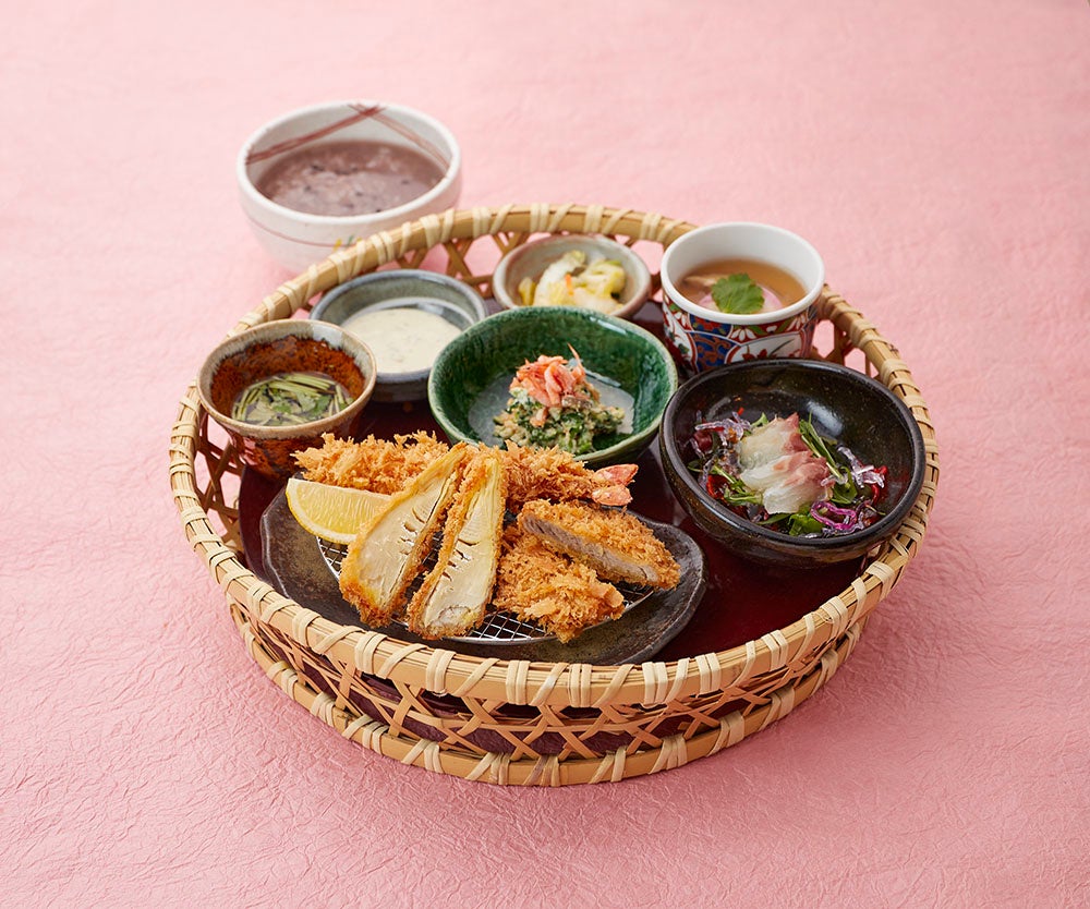 プリプリ食感のバナメイ海老・桜色と香りが楽しめる桜海老・うま味と甘みの甘海老を使用したつなぎなしのプリプリの海老かつ、国産のシャキッと歯ごたえの良い2Lサイズのアスパラや柔らかな筍を使用した肉巻きかつ、長崎県五島列島で水揚げされた真鯛に大葉を挟んだ真鯛かつに加え、6種類の穀物をバランス良く配合した飼料で育てたコクと甘さのある肉質が特長の広島の銘柄豚“瀬戸内六穀豚”を使用した六穀豚ロースかつを贅沢に盛り合わせました。