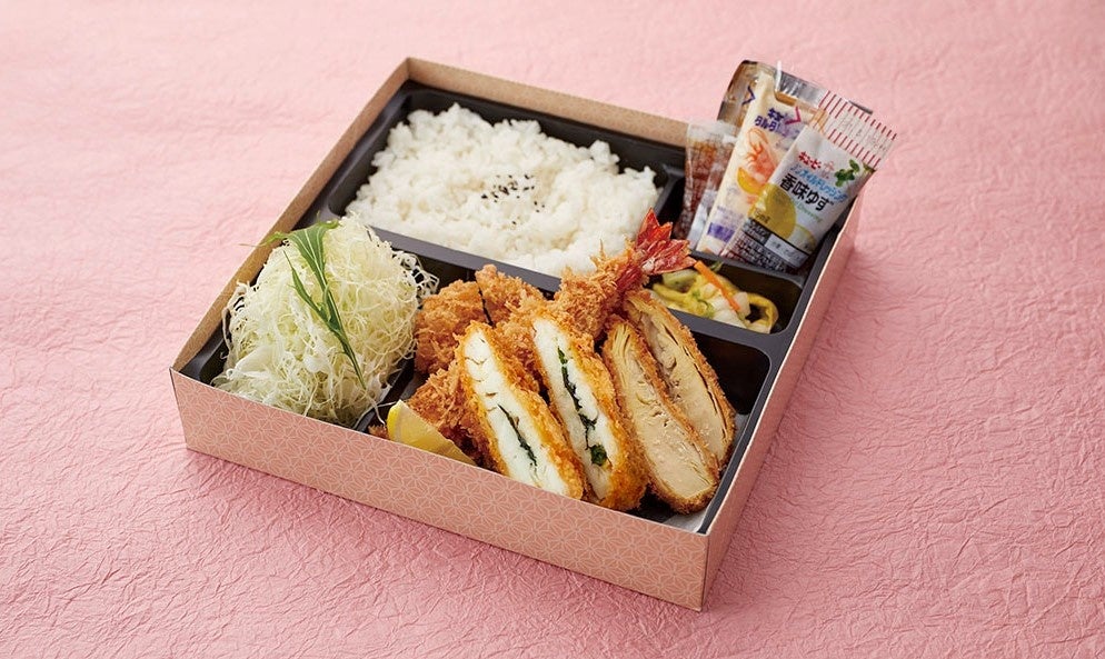 プリプリ食感のバナメイ海老・桜色と香りが楽しめる桜海老・うま味と甘みの甘海老を使用したつなぎなしのプリプリの海老かつ、柔らかな国産筍の肉巻きかつに、長崎県五島列島で水揚げされた真鯛に大葉を挟んだ真鯛かつと、うま味を閉じ込めた本格的な味わいのヒレかつを合わせたバラエティ豊かな旬の味わいが楽しめます。