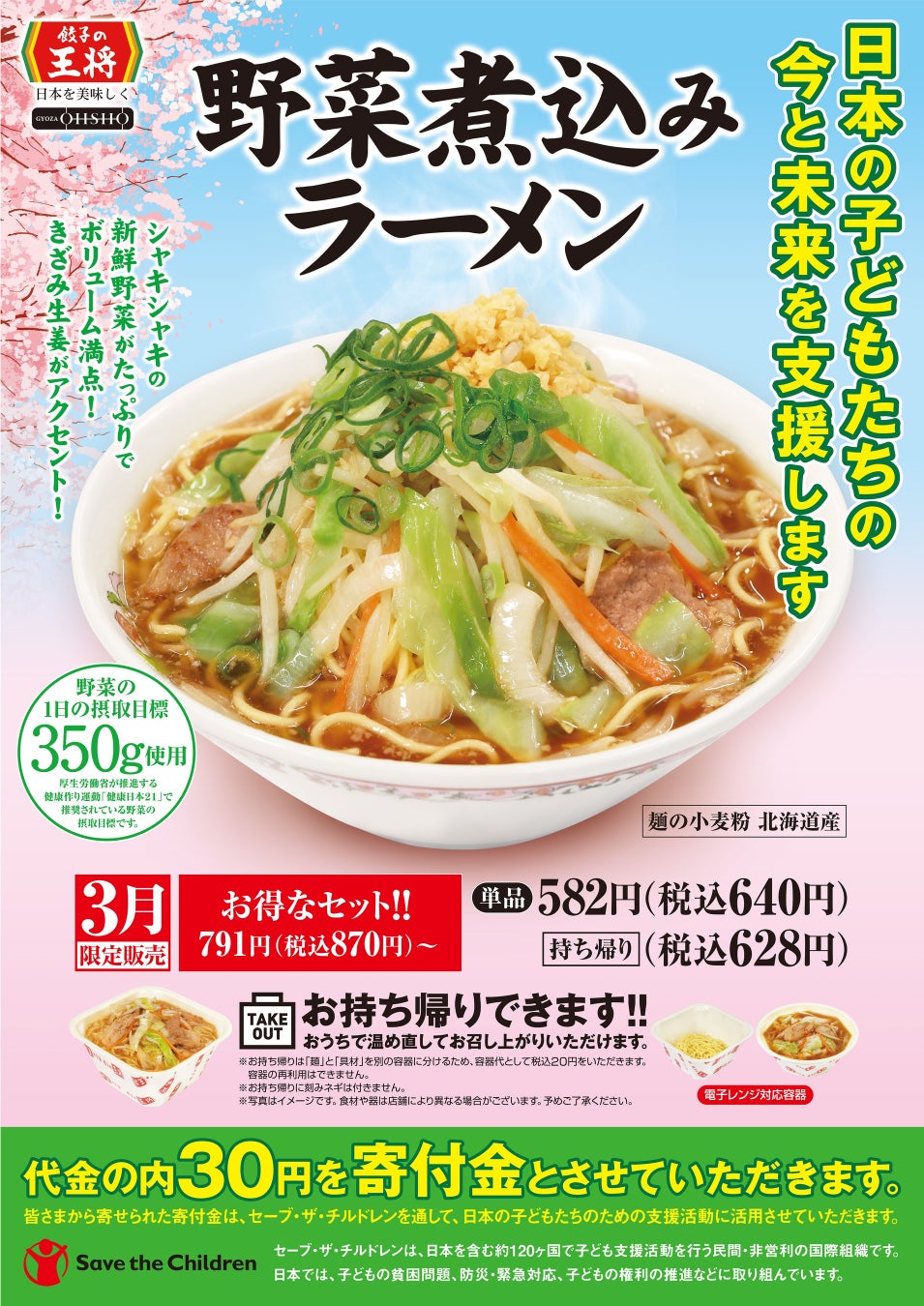 「餃子の王将」を運営する株式会社王将フードサービス(京都市山科区/代表取締役社長 渡邊 直人)は、3月限定で「野菜煮込みラーメン」を販売します。