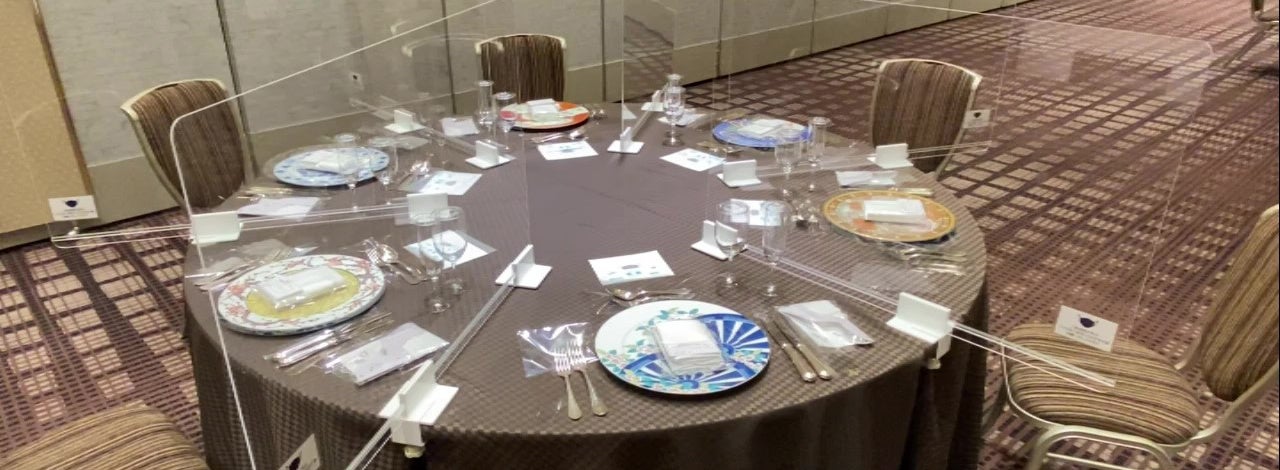 ホテルグランヴィア京都の宴会場では、アクリルボードの設置や、空気の入れ替え、エチケットリーダーの配置、いつでもマスクの徹底など安全・安心なお食事のために様々な取り組みを行っています。