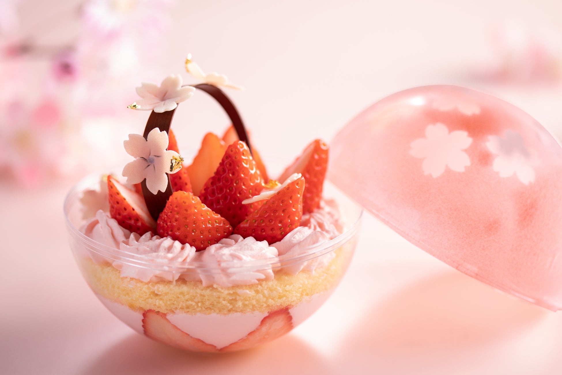 透明のカプセルにスイーツを閉じ込めた、華やかな断面アートも楽しめるフォトジェニックなスイーツです。いちごのコンポート、桜フレーバーのクリームとスポンジを入れ、桜の花びらをモチーフにしたチョコやいちごなどをトッピングしました。カプセルの蓋にはピンク色のカカオバターで桜の花びらを模りました。