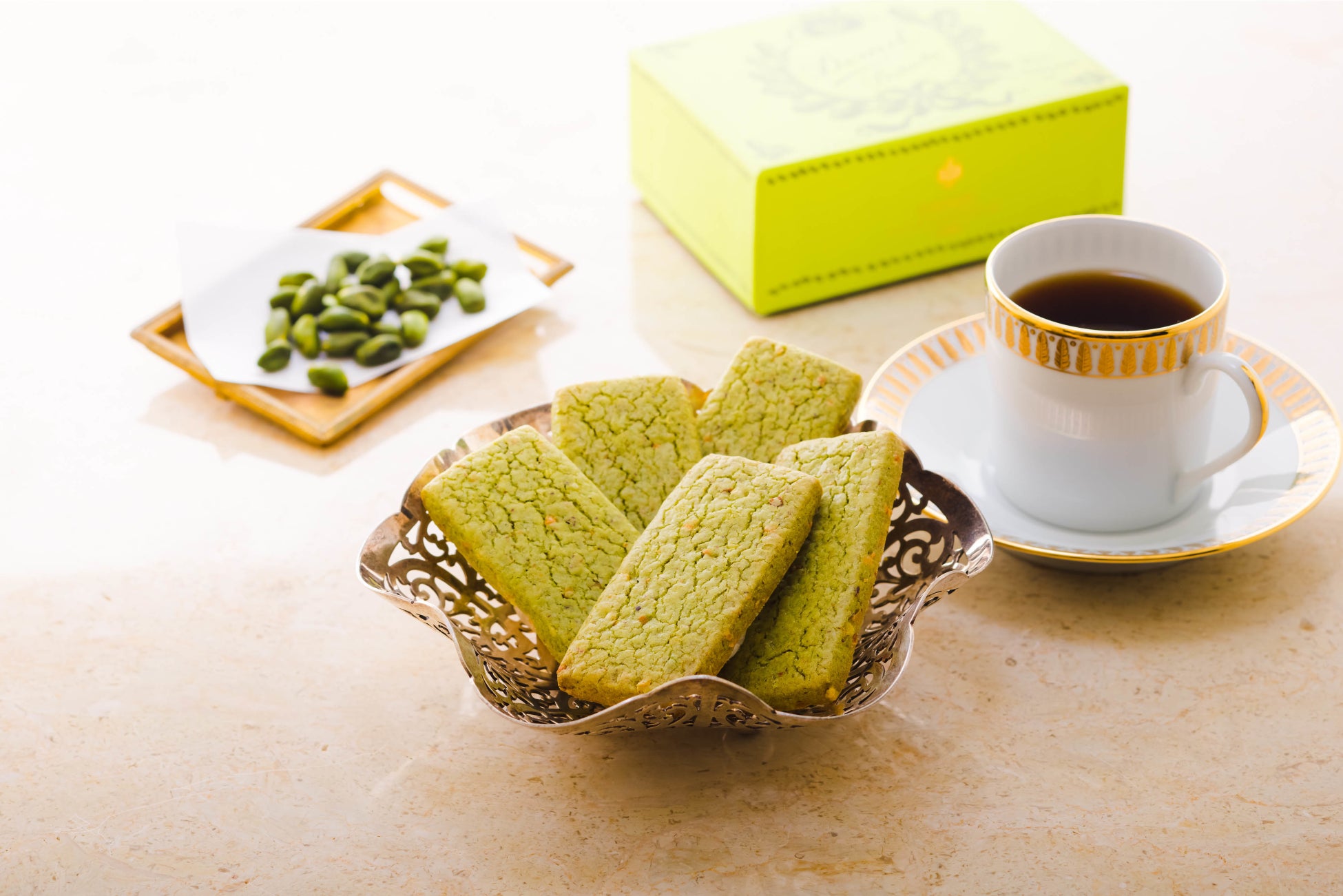 商品特長:バターの風味とピスタチオの香ばしく甘い香りが広がるクッキー。