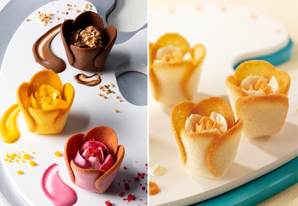 金井理仁シェフの代表作「チューリップローズ」は、繊細なラングドシャクッキー細工のチューリップの中に、とろけるホイップショコラのローズを咲かせました。