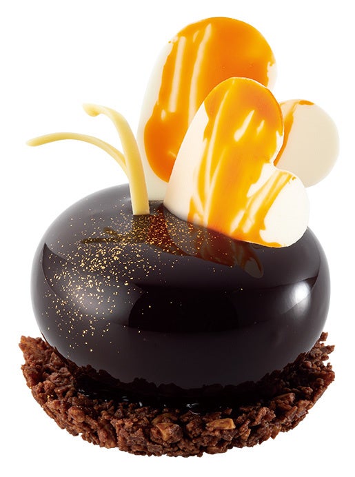カカオの濃厚な香りに誘われたパピヨン(蝶)。蜜がとろけるアプリコットコンフィを隠したショコラのつぼみです。炭火ショコラを使った濃厚なコクのショコラムースに、アプリコットコンフィの甘酸っぱい味わいがアクセント。