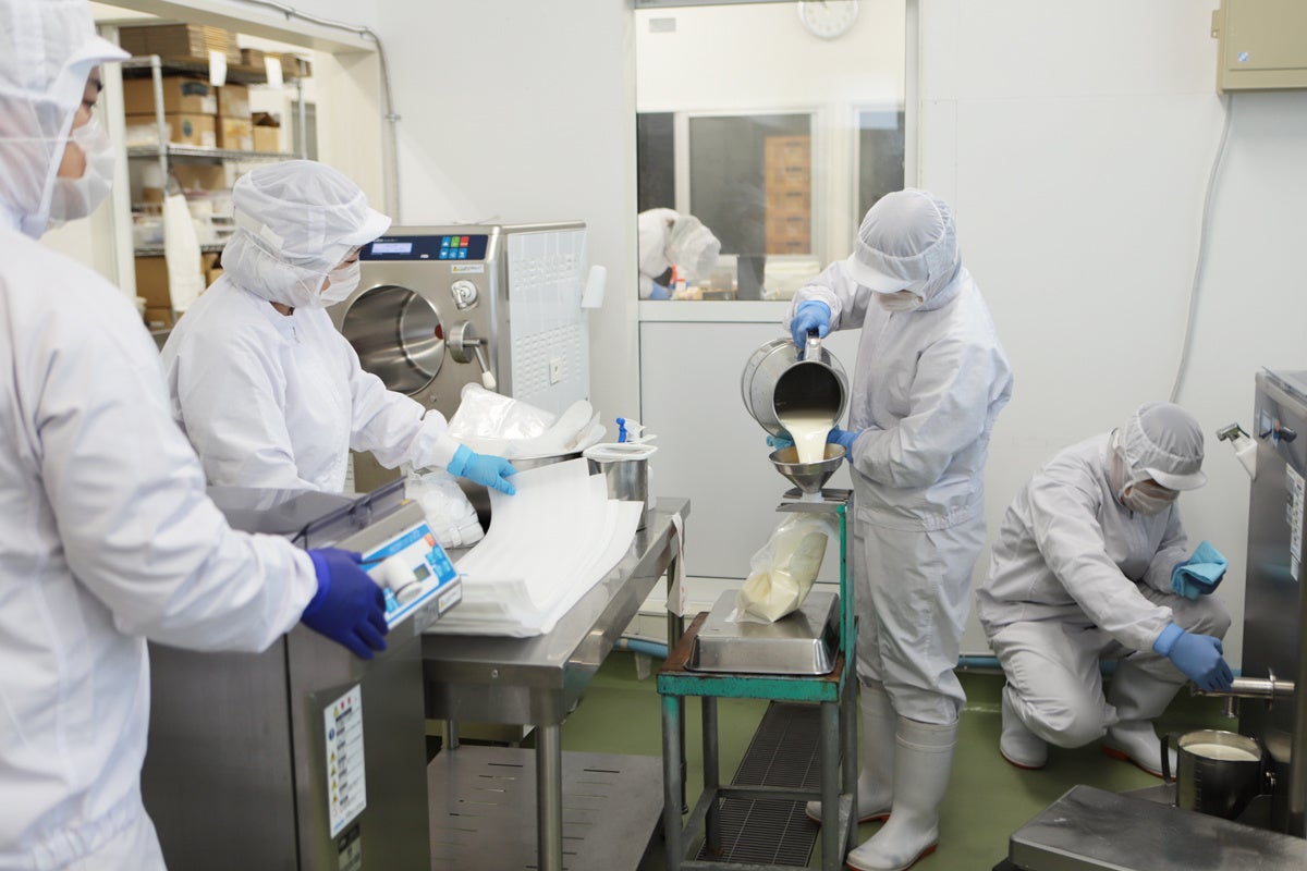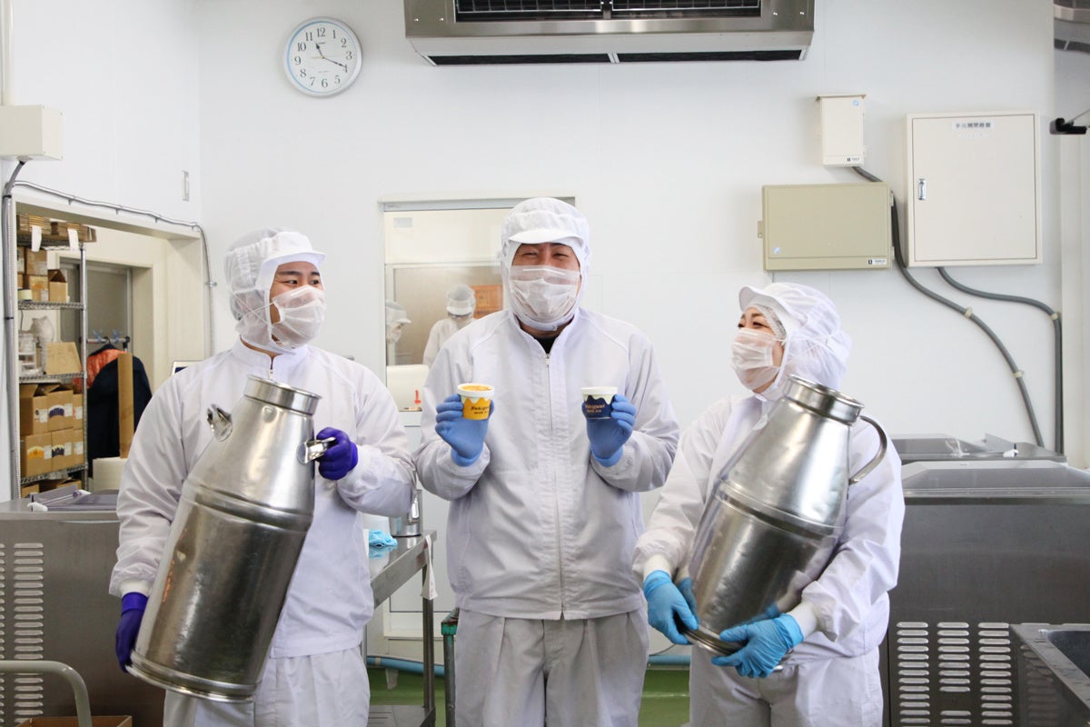 しかし、2015年に工場長が急逝され、工場の稼働は停止となってしまいました。このままでは地域とつながった産業が途絶えてしまい、何よりもこの土地で愛されていた乳製品の味がなくってしまうことを危惧した弊社は、本工場の取得、乳製品加工製造の継続稼働(事業継承)することを決めました。先代の工場長が作り上げた製法とレシピ、そしてその思いを引き継ぎ、ここに乳製品加工経験あるスタッフを迎え入れ、現在ソフトクリームミックスを中心に、カップアイスクリームの製造などを行なっています。