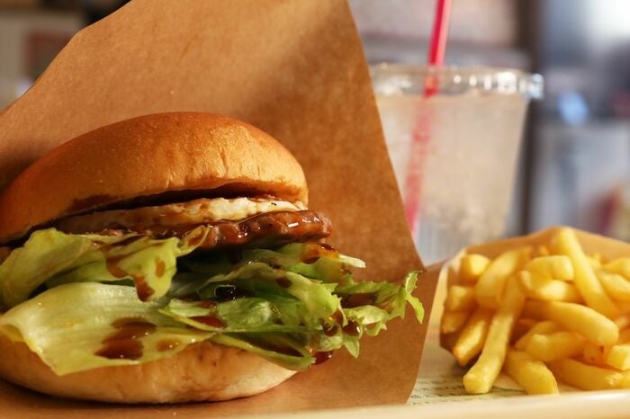 独自の製法で作る熟成照り焼きソースを程よく絡めた、「GON照り焼きバーガー」490円は大人気商品で、大きめのバンズに、自家製パティとレタス、目玉焼きが挟み込まれて、トロトロの熟成オリジナルてりやきソースがたっぷりかかっています。