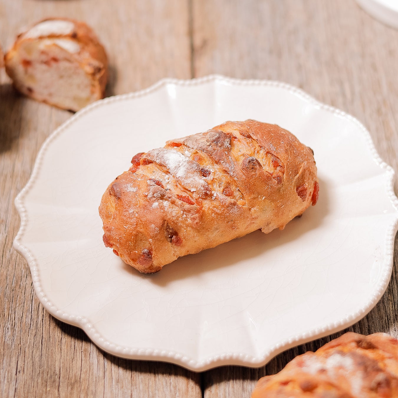 ドライいちご・マカダミアナッツ・ホワイトチョコの入ったカンパーニュ。ほのかなバジル とオリーブオイルの風味がアクセント。