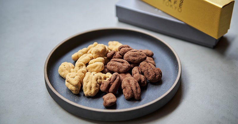 カカオのほろ苦さと⽢さがペカンナッツの⾹ばしさと重なり、バランスよく⼝の中に広がります。ココアパウダーでコーティングすることで⾆触りのよい⼀品となっています。
