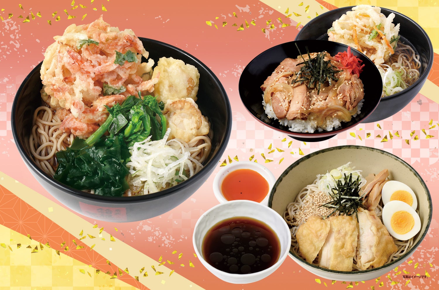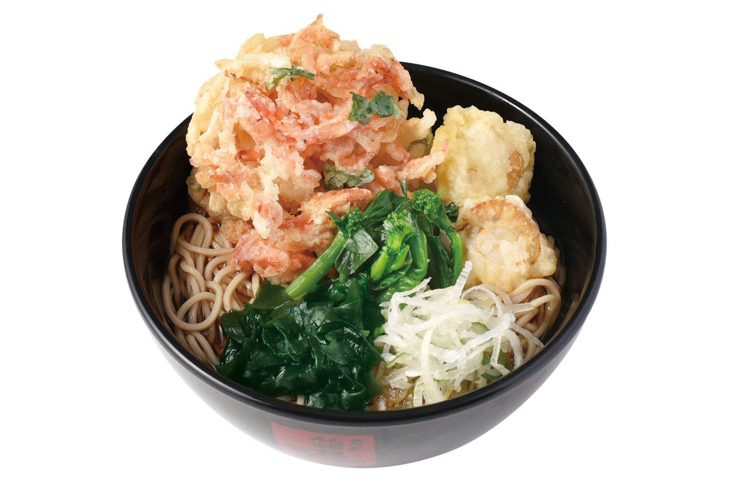 今回のラインアップは「桜海老のミニかき揚げ天とほたて天 ~菜の花添え~(そば・うどん)」、「鶏天のピリ辛つけ蕎麦(そば・うどん)」、「バラチャーシュー肉めし丼セット(そば・うどん)」の3品です。