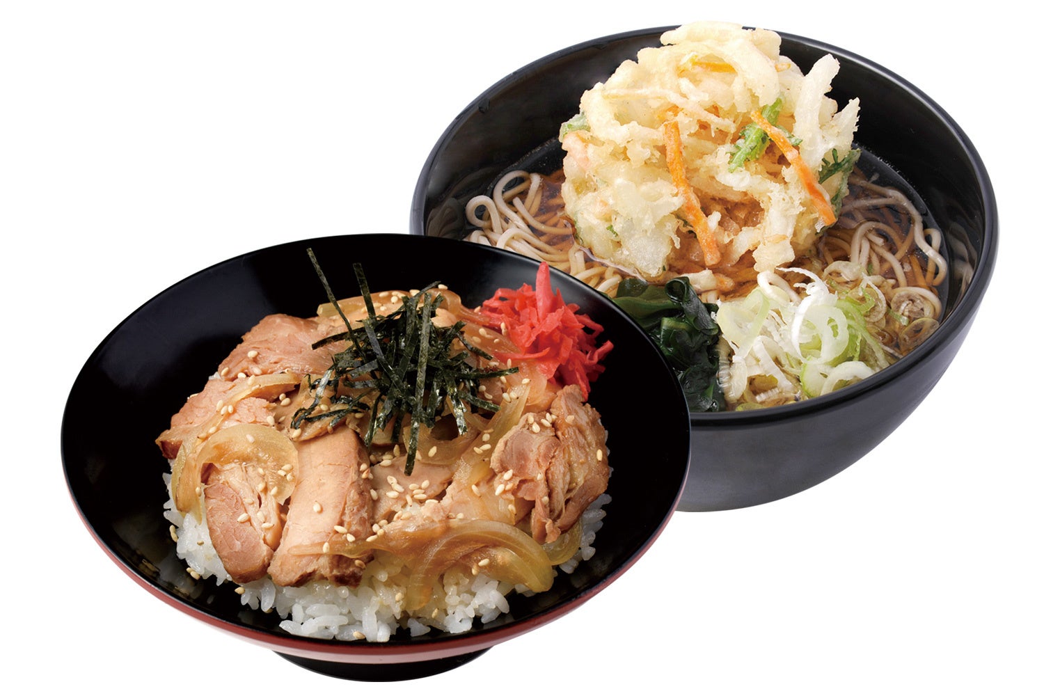 「鶏天のピリ辛つけ蕎麦(そば・うどん)」および「バラチャーシュー肉めし丼セット(そば・うどん)」は、一部取扱いがない店舗がございます。
