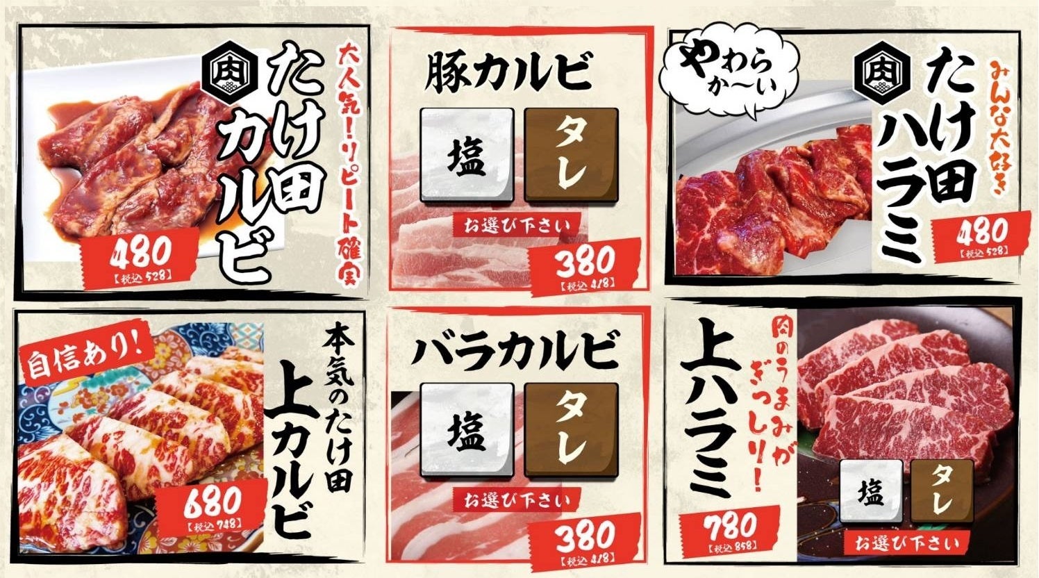 その時々で最も質の良い肉を厳選して仕入る「本気のたけ田 上カルビ」680円(税込748円)や、コストパフォーマンスに優れた「たけ田 カルビ」480円(528円税込)、霜降りのサシが入った和牛メニュー680円(税込748円)等、当店では価格以上の上質な肉も各種取り揃えております。ぜひ肉質の違いをお味わいくださいませ。