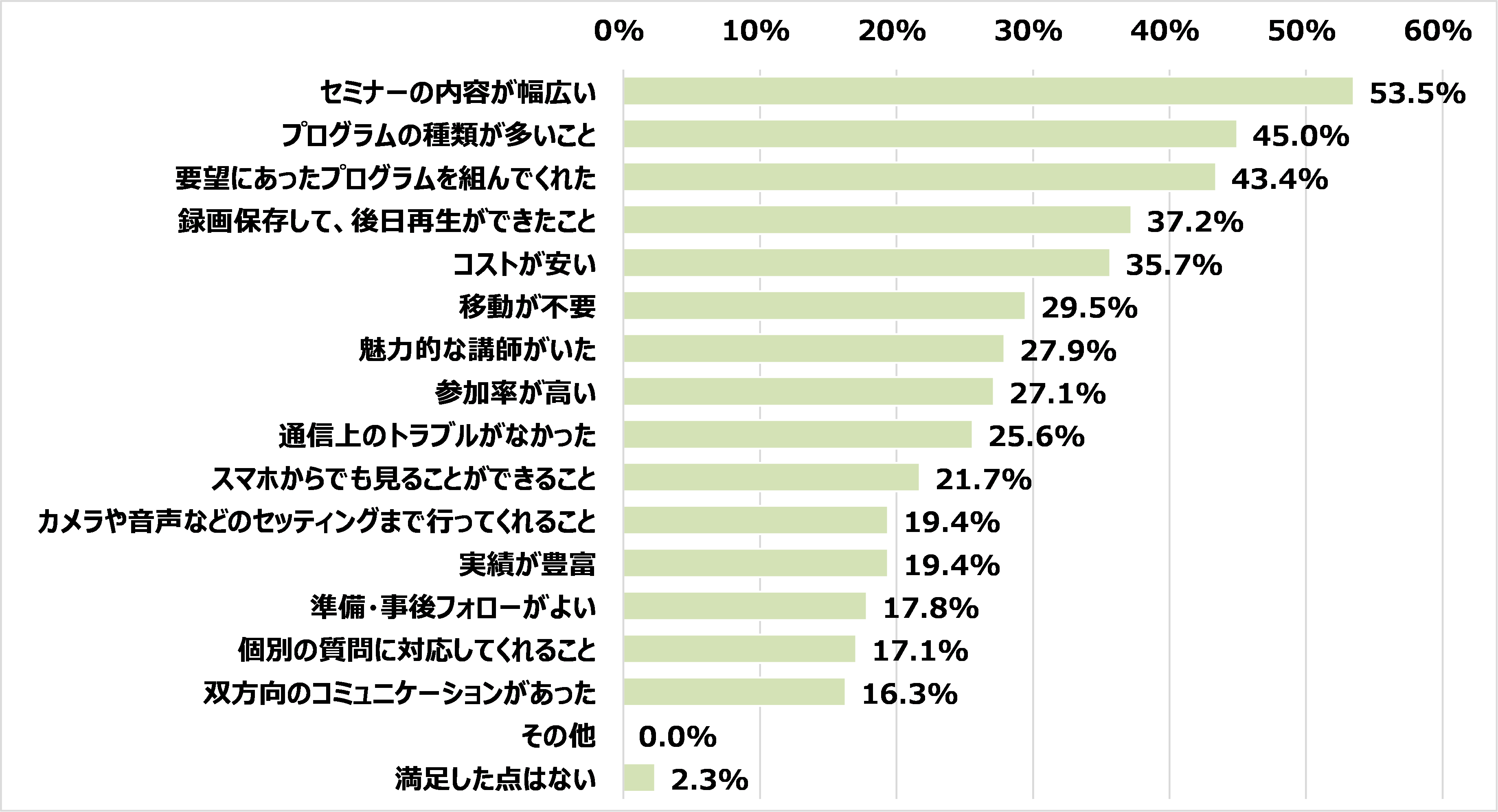 ・オンラインセミナーを実施した企業の健康経営に携わる経営層・部門担当者に対し、オンラインセミナーのメリットを聞くと、「セミナーの内容が幅広い」53.5%、「プログラムの種類が多いこと」45.0%、「要望にあったプログラムを組んでくれた」43.4%という回答が多い。