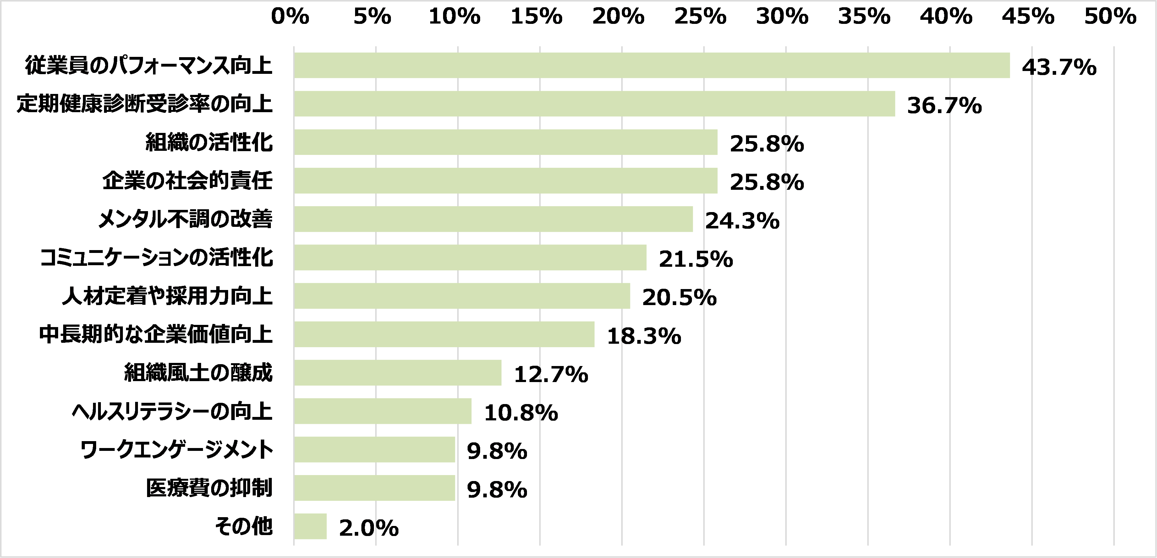 ・実際に健康支援を行ったところ「従業員のパフォーマンス向上」(43.7%)、「定期健康診断受診率の向上」(36.7%)、「組織の活性化」「企業の社会的責任」(25.8%)といった効果があったと回答している(Q5)。