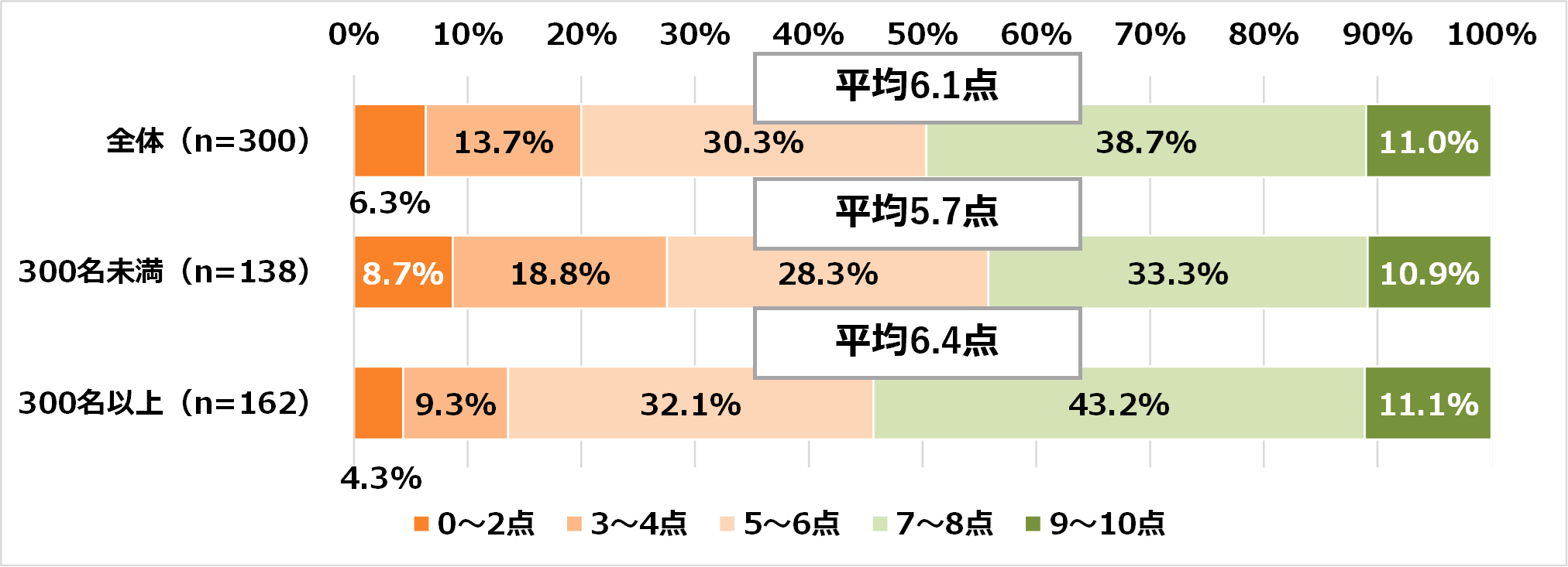 ・企業規模で比較すると、従業員数300名未満の企業の平均は5.7点、300名以上の企業の平均は6.4点となっている。