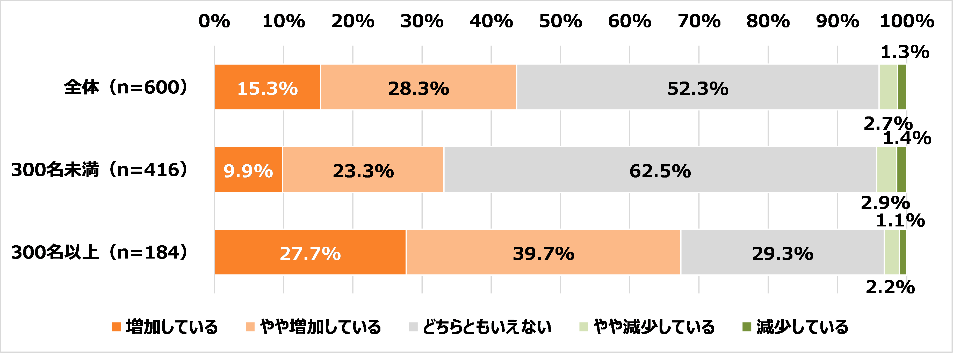 ・企業規模で比較すると従業員数300名未満の企業は「どちらともいえない」、300名以上の企業は「増加している」「やや増加している」という回答が多い。