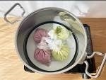 お皿を敷いた鍋に水を1/2入れ、材料の入ったポリ袋を入れ蓋をして火をつける。