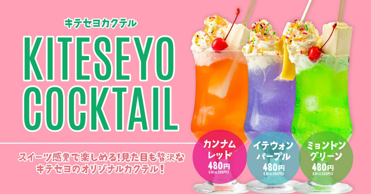 韓国の人気都市をイメージした映え必至の『キテセヨカクテル』(480円税抜き)はスイーツ感覚で楽しめるカクテル♪ノンアルコール仕様にも変更可能です。